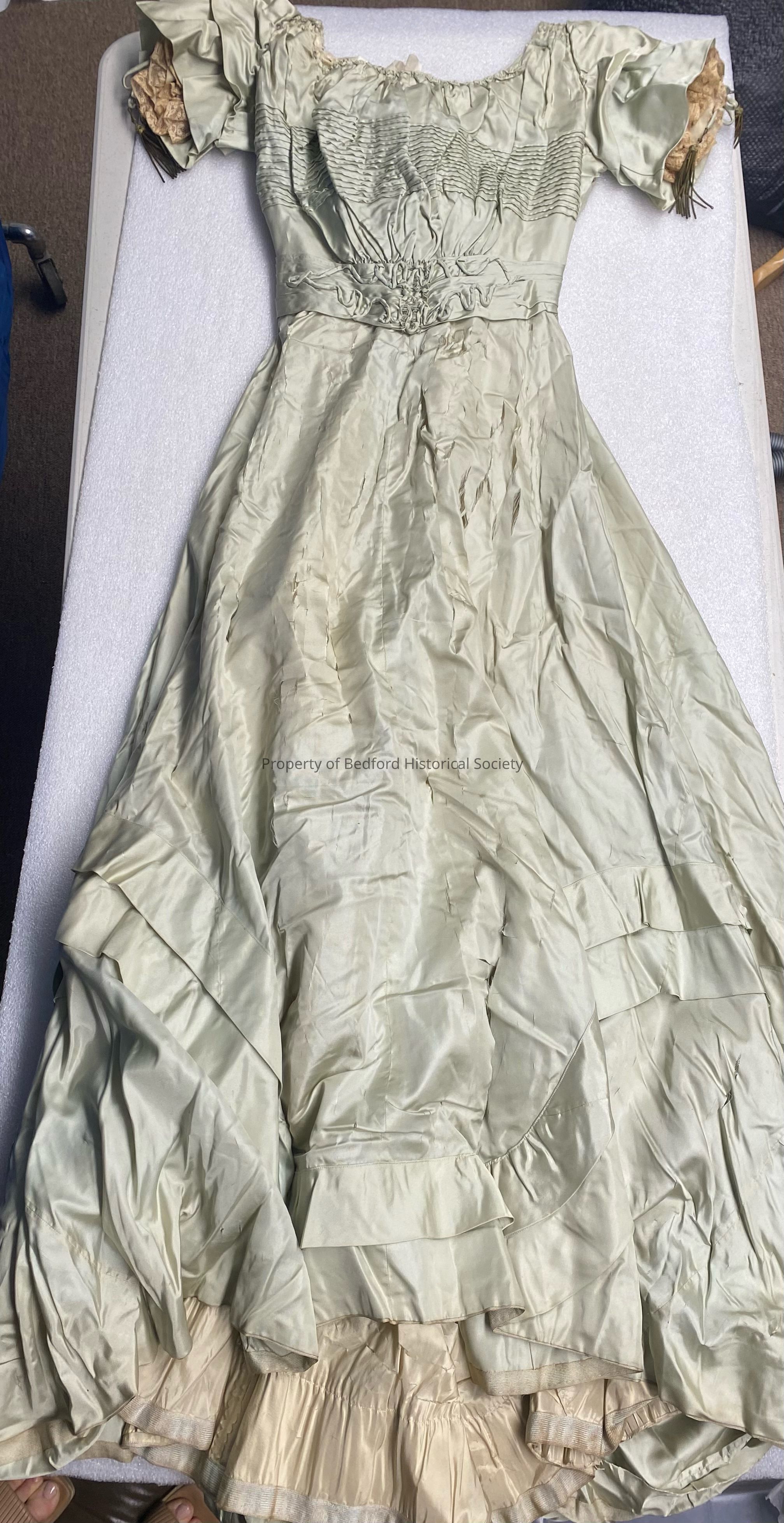 Aqua taffeta Ballgown with trim on sleeves, skirt in poor condition, c.1900