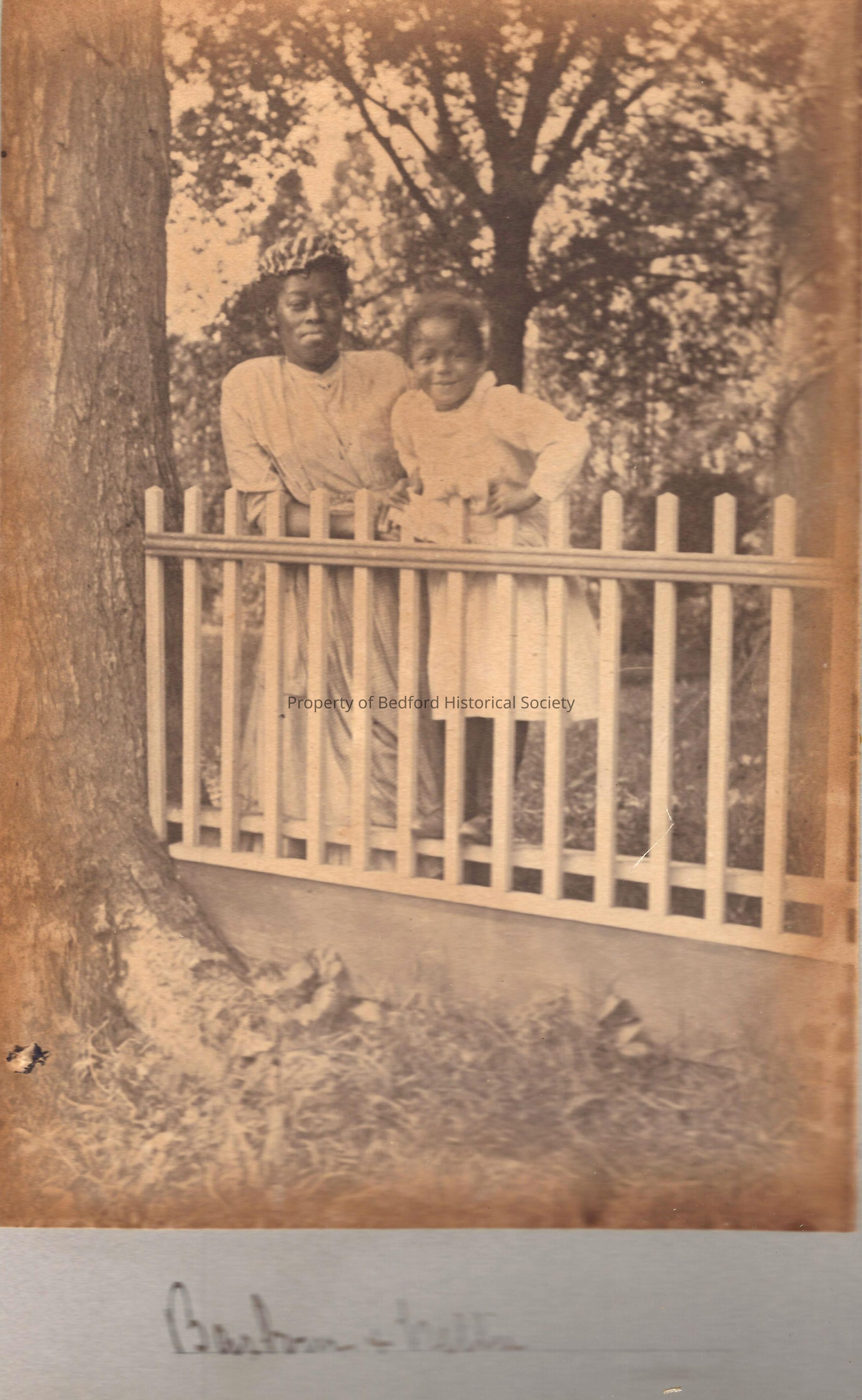 B & W photograph of an African American woman and a little girl leaning on white fence. Under the photograph is the inscription "Barbara & Nellie". Part of Renwick scrapbook.