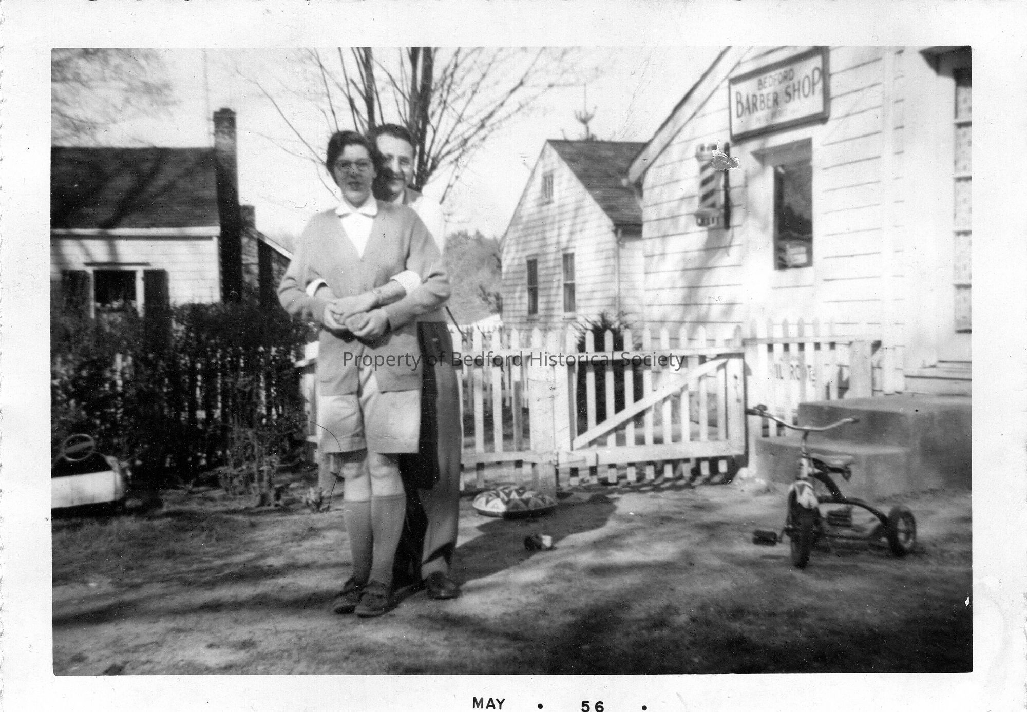 Gertrude (Geri) Glasser Ludwig Feinstein with late husband Ben Ludwig standing in front of the Bedford Barber Shop (May, 1956)