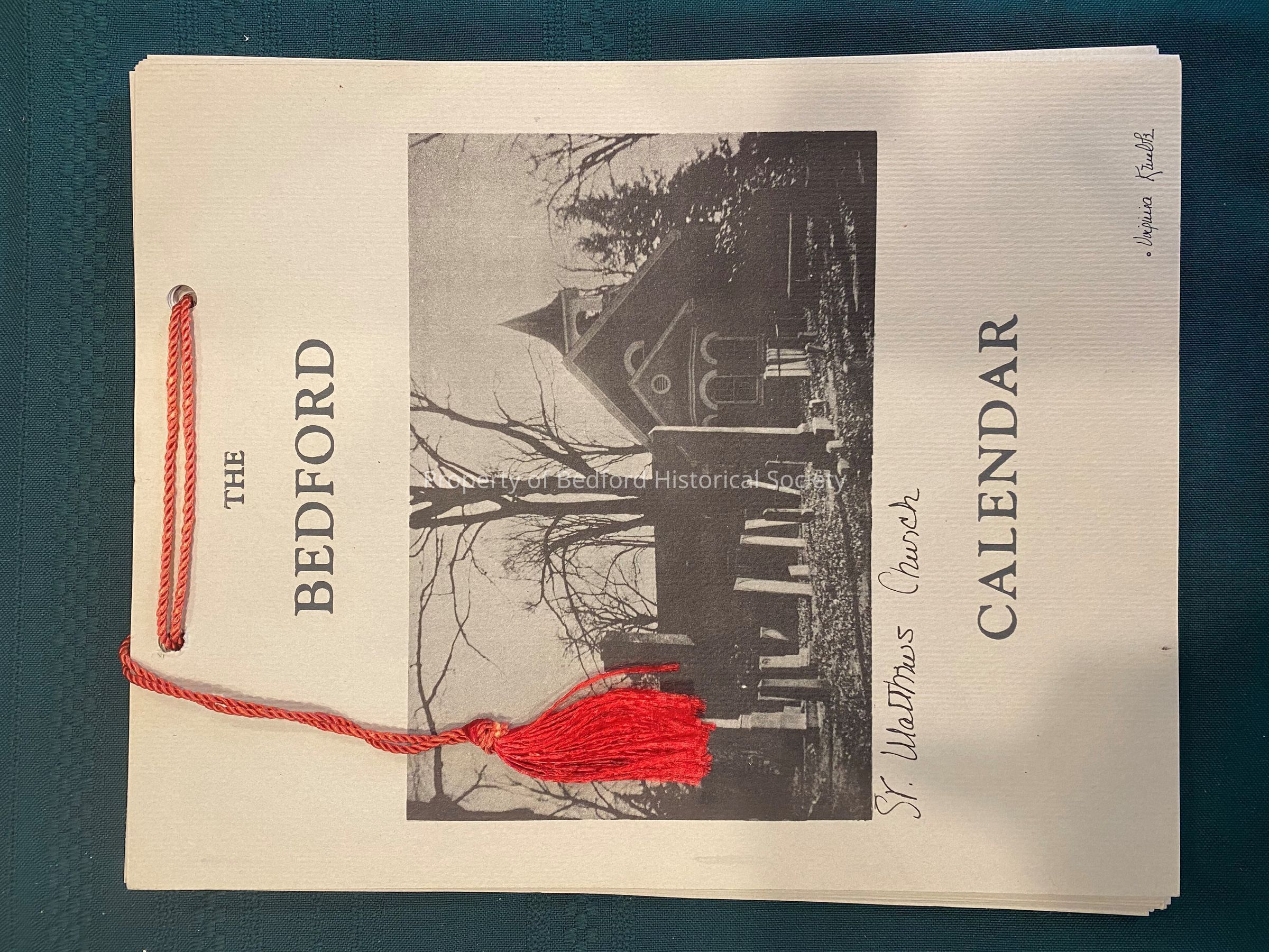23 pages on cardstock grey paper tied with ribbon. Features calendar pages and photographs on every other page. Handwritten insciptions under each photograph: St. Mathew's Church, Bird House, "Uavarre?", Asperong? Lake, The Clock Tower, Bedford House, Fairy lake Cottage, "Boxes?? in Shadow, The Free Library, Bedoford "Honour??", Mathew's Will Bridge?, The Old Griss Barn.
