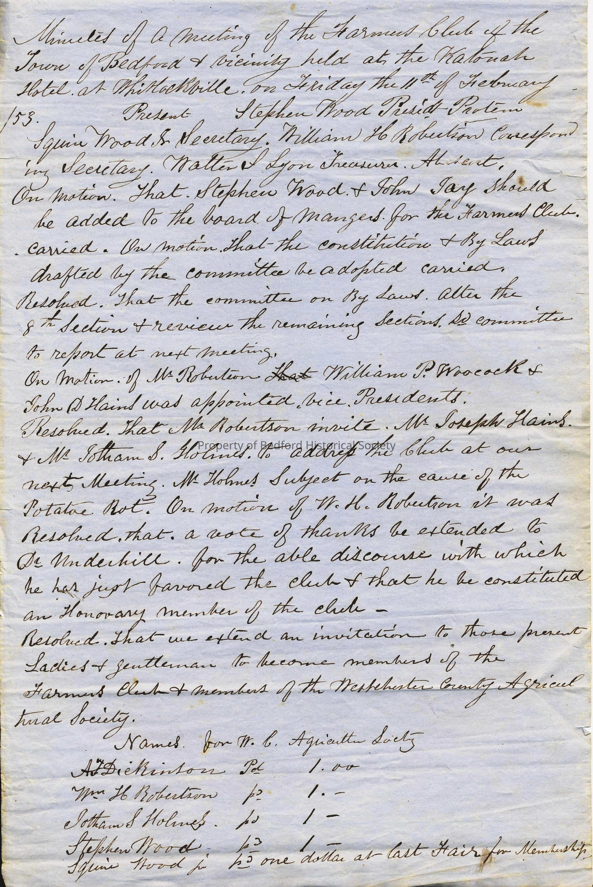Bedford Farmers' Club Minutes, Feb. 11, 1853 *includes transcription in Transcriptions Binder (42.1.5b)