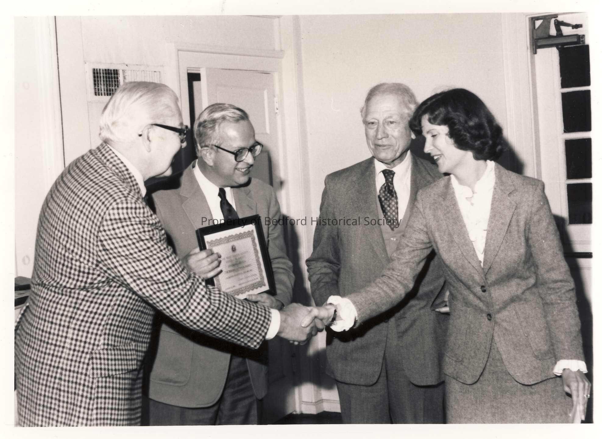 Halstead Park, Jr., Lloyd B. Cox, Jr. and Donald Marshall accept the 1980 "Local History Society Recognition Award" from Susan Swanson of the Westchester County Historical Society