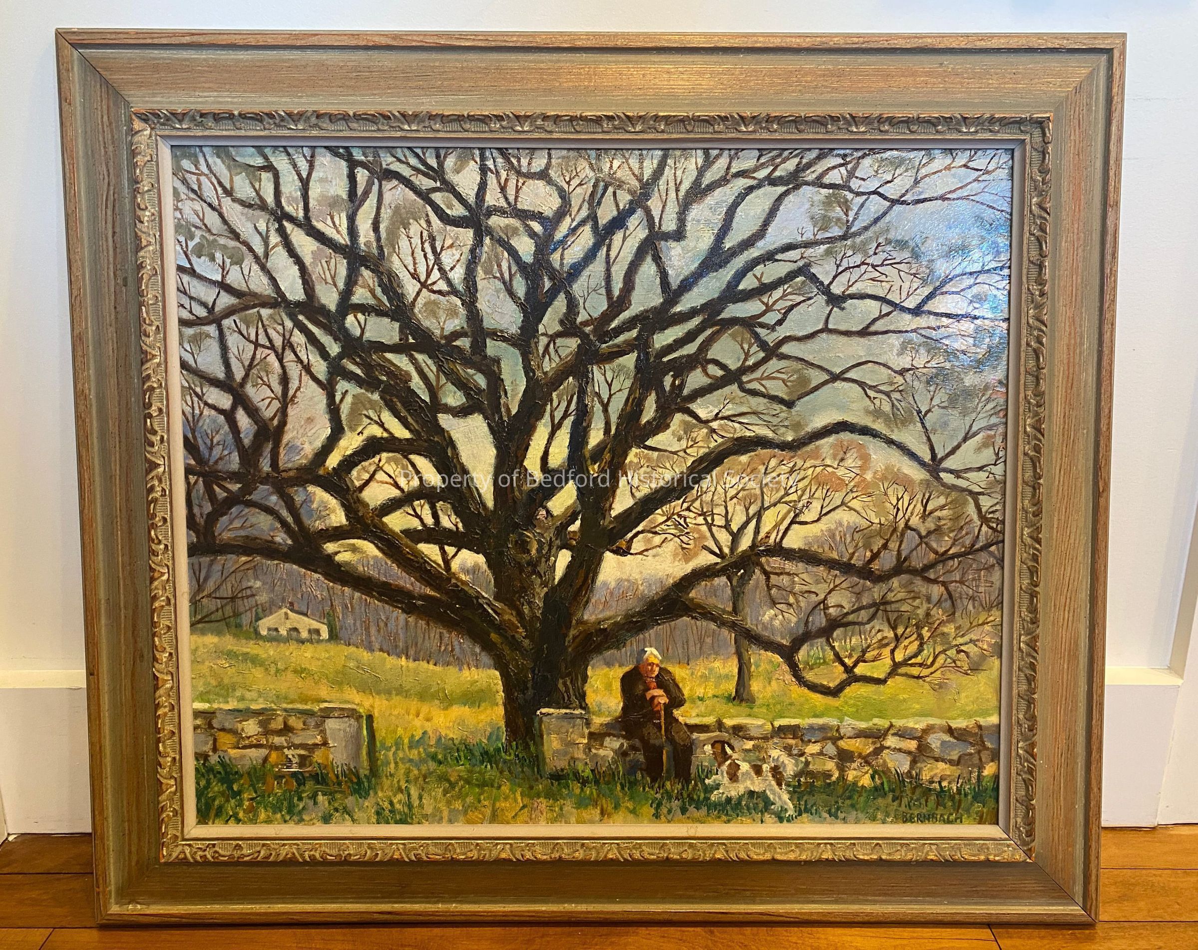 Painting of old man sitting on stone fence with dog in front of Bedford Oak