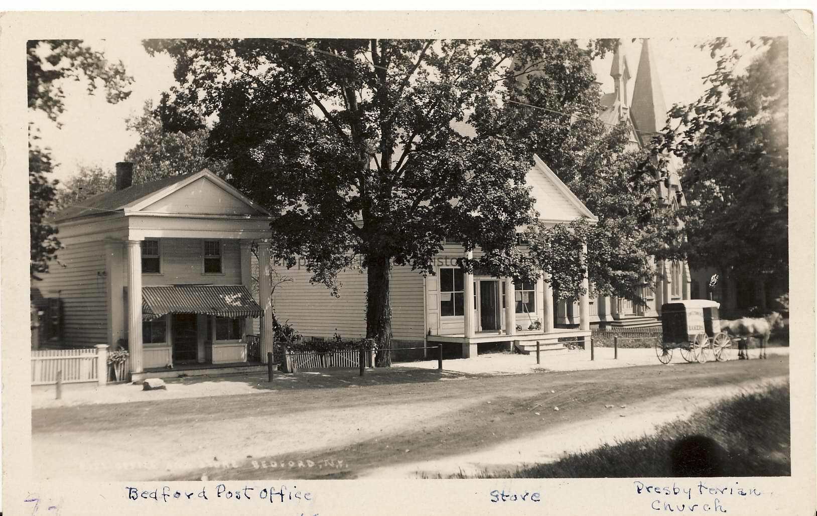 Same as 813, 1438. At left: Bedford Post Office on its original site next to Academy Building. Formerly the saddlery shop of Benjamin Ambler, it was moved in 1930 to make room for the fire house