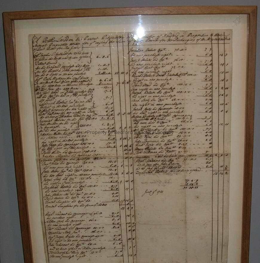 Bedford Tax Assessment Roll, dated June 9th, 1713, list of tax payers and acreage owed to pay the Queen (Anne) for Quit Rent for 10 years (framed)