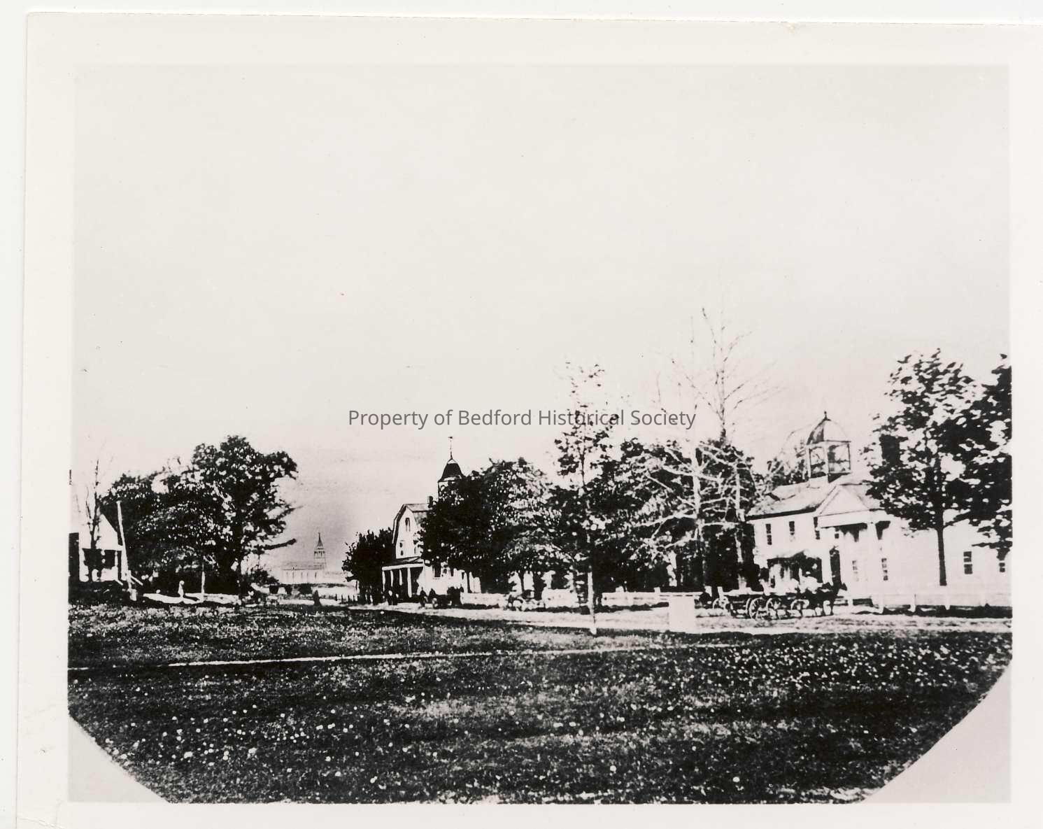 1-Bedford Village in 1867. L to R: Hotel, 3rd Presbyterian Church (in background), Court House, Academy & Post Office