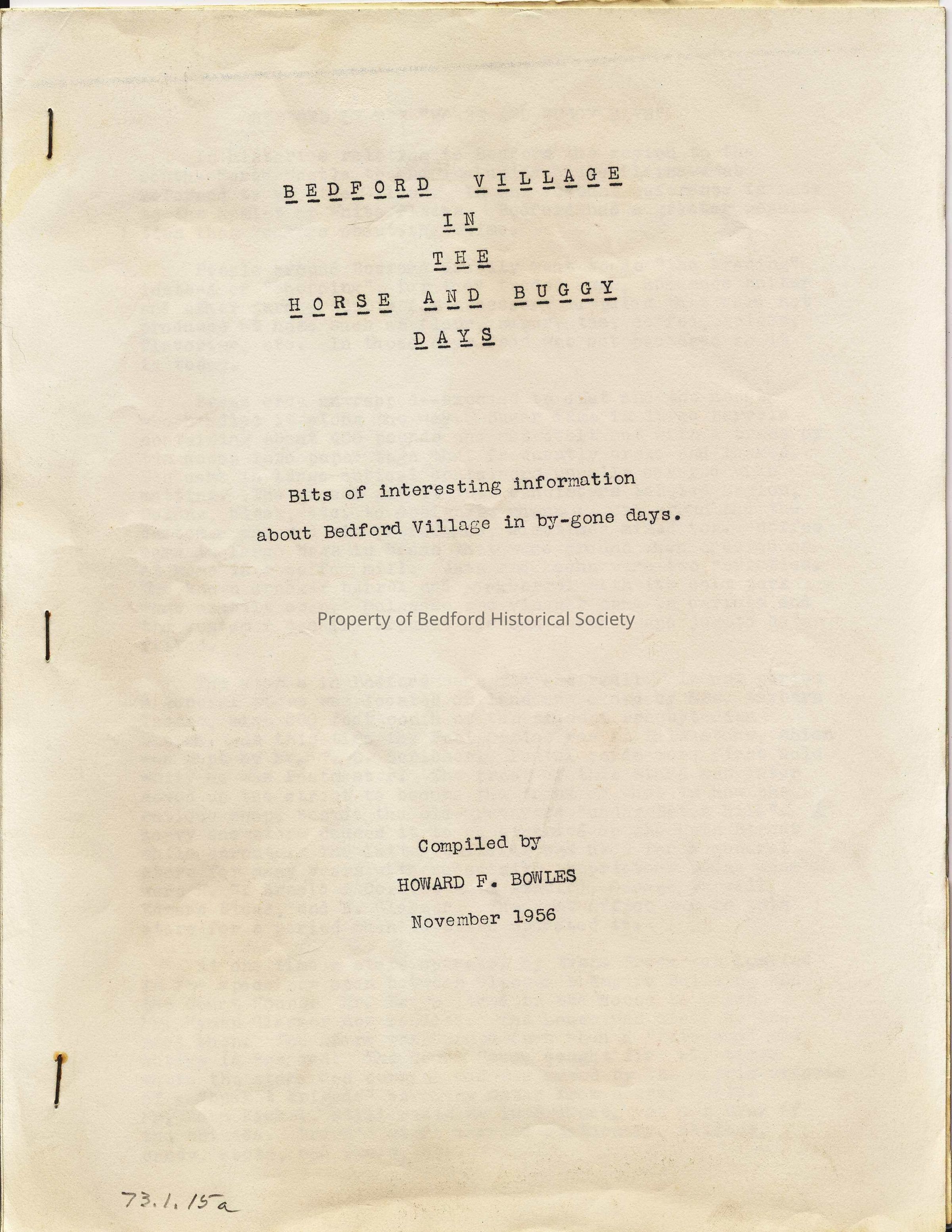 "Bedford Village in the Horse and Buggy Days" compiled by Howard F. Bowles, November 1956Entry/Object ID
