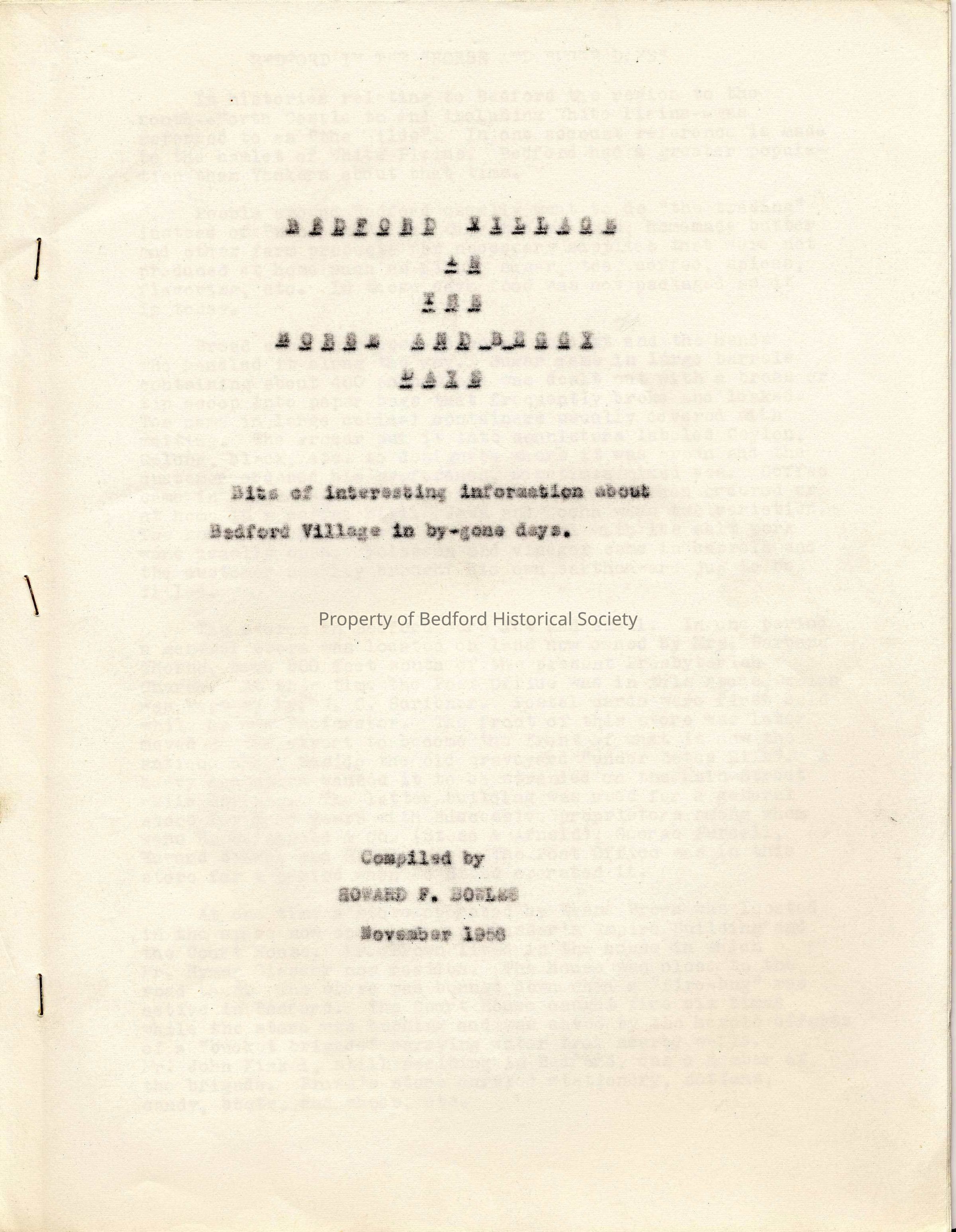 "Bedford Village in the Horse and Buggy Days" compiled by Howard F. Bowles, November 1956Entry/Object ID