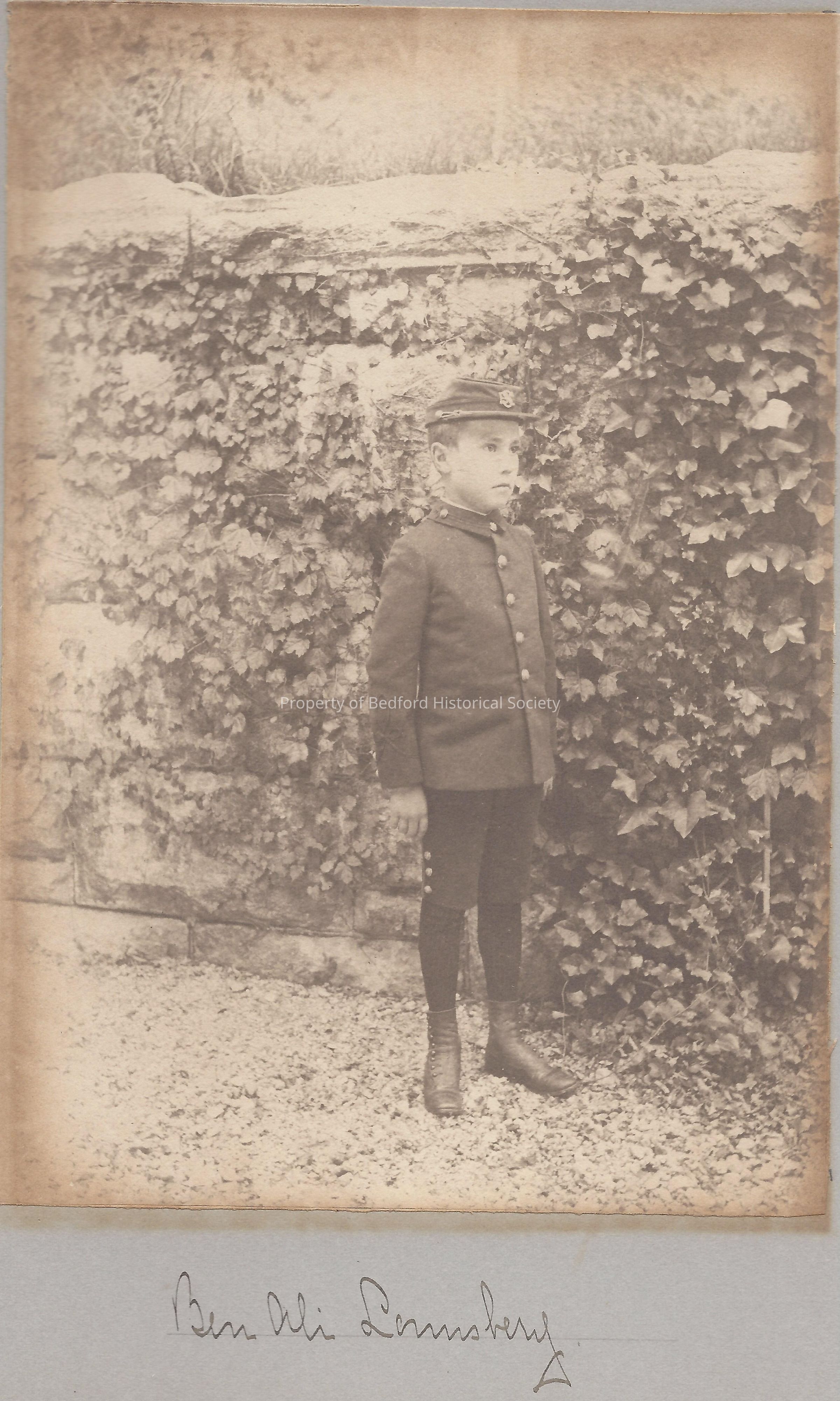 photograph of Ben Ali Lounsbery standing in front of ivy covered wall in a miniature uniform. Part of Renwick scrapbook.