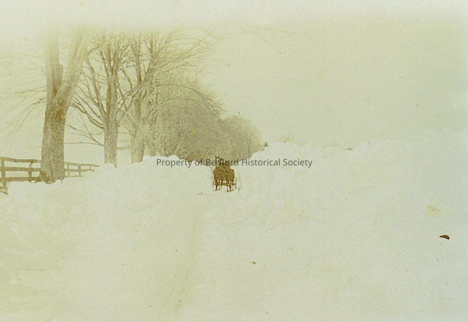 B + W photo of blizzard of 1888 with horse and carriage in the snow