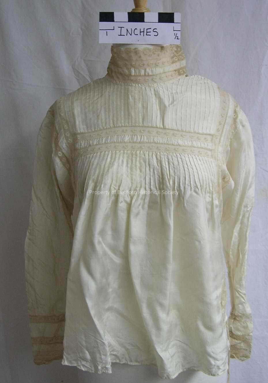 Lingerie blouse, turn of the century, white China silk with high collar and yoke of bands of Valenciennes alternating with bands of silk, the yoke with many hand pin tucks, very good condition.
