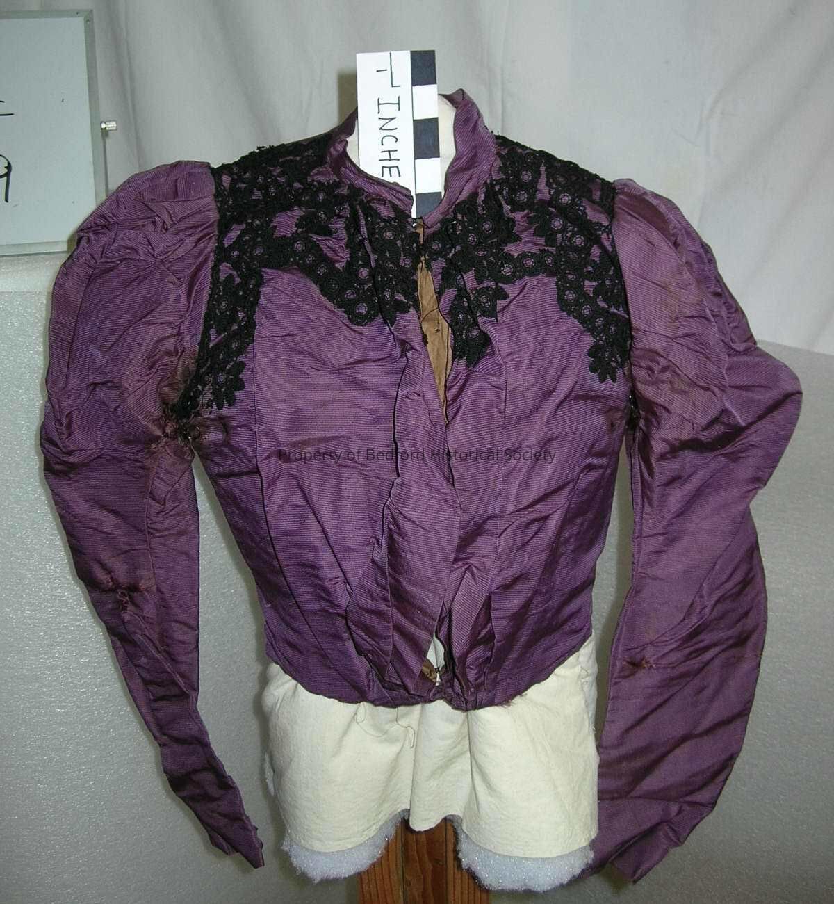 Bodice, purple ribbed silk, made from same fabric as A.08.22--possibly from matching skirt, 1890s, with modified gigot sleeves trimmed with black passementerie like trim, poor condition.