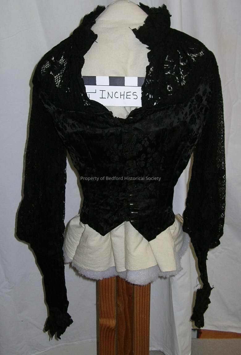 Bodice, 1890s, black patterned silk woven with a small floral design, the yoke of black lace, interesting gigot sleeves, the gigot puff of black mesh lace, the long cuff of the patterned silk, fastening with many braided ball buttons.