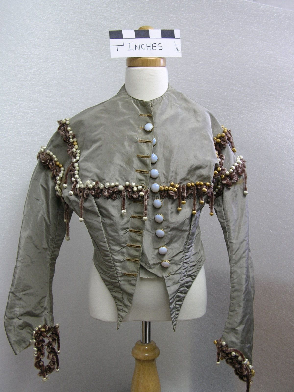 Grey silk bodice, 1860s, trimmed with interesting chenille fringes in taupe with yellow and white balls, very large buttonholes and large flat buttons of white glass set in gilt metal filigree crown like bezels, lots of damage. Buttons probably originaly pearl finished.