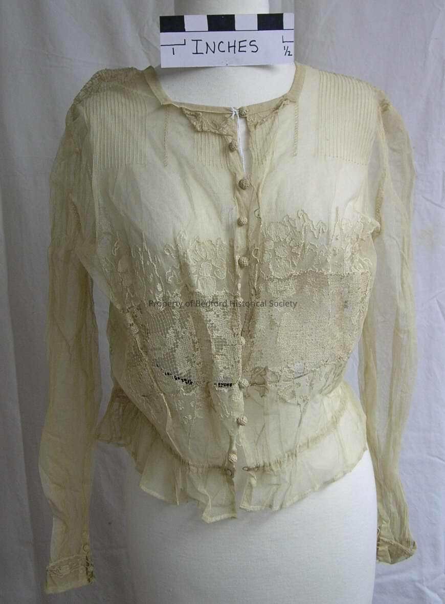 Lingerie bodice, circa 1910, ecru net worked with pin tucks, lily pad embroidery, crocheted ball buttons, inset with a band of buratto lace, good condition.