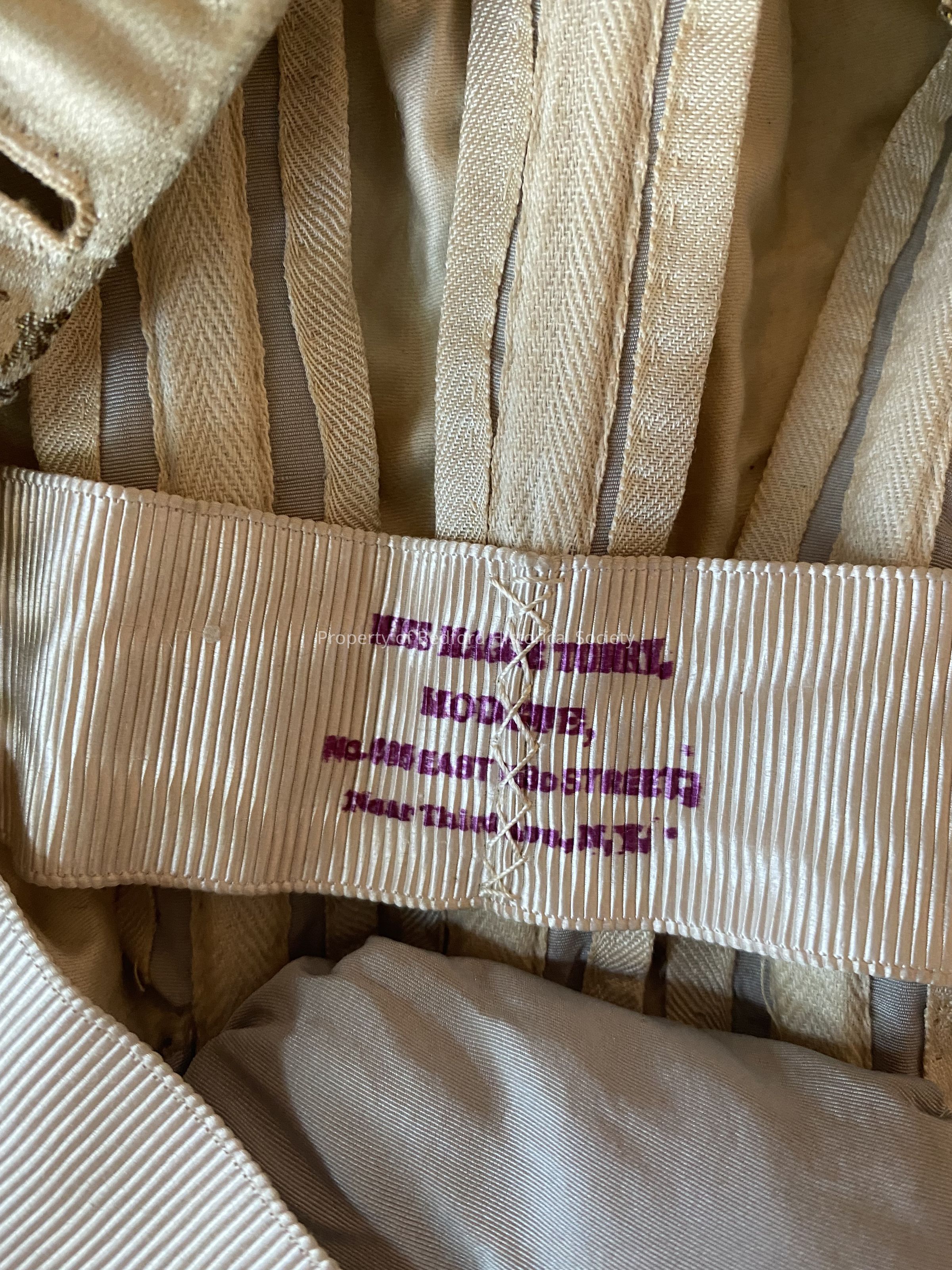 gray? bodice with flower trim Built in tag reads in fuscia print " Miss Maggie Turell(?), Mod(?)/ No 1335 East (?) Street/ Near Third Ave (?) N.Y.
