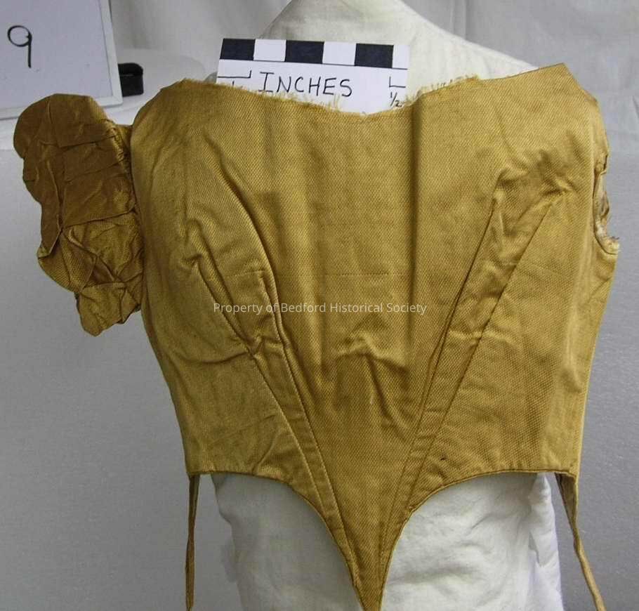 Early dress bodice, 1850's, Mustard/gold silk woven with a tiny diaper pattern, wide neckline with trim removed, one double puffed sleeve, deep points at waist trimmed with self piping, boning part of the bodice, unusual padding at right breast, bodice made to be laced up the back, one sleeve removed.