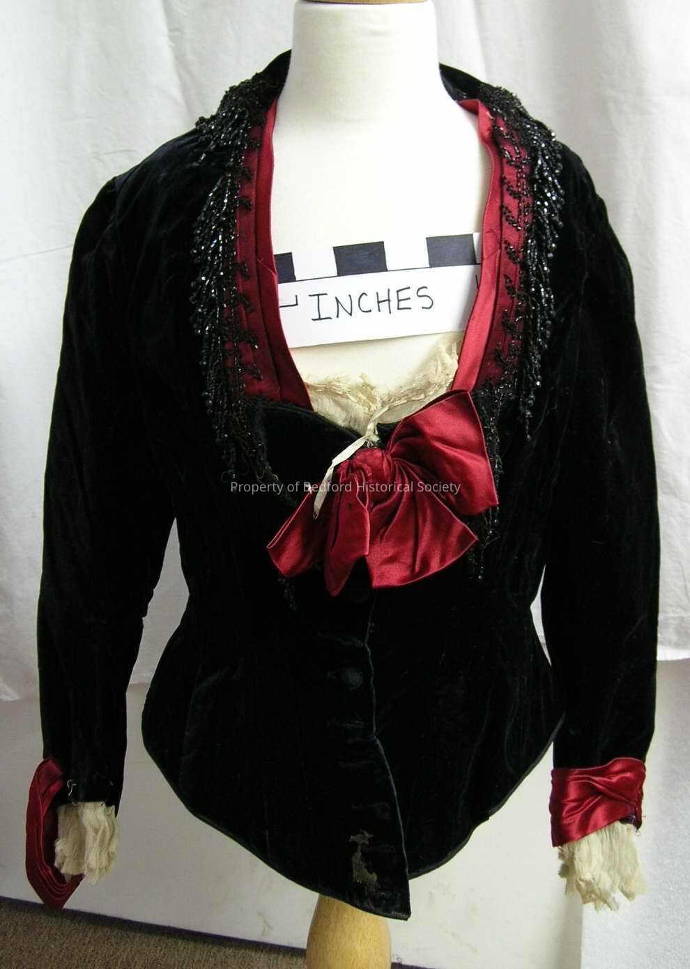 Bodice, 1880s, deep navy blue velvet trimmed with red satin with black crocheted ball buttons, some stains, interesting back, label "M.A. Connelly, 7 E 16th St. NY"