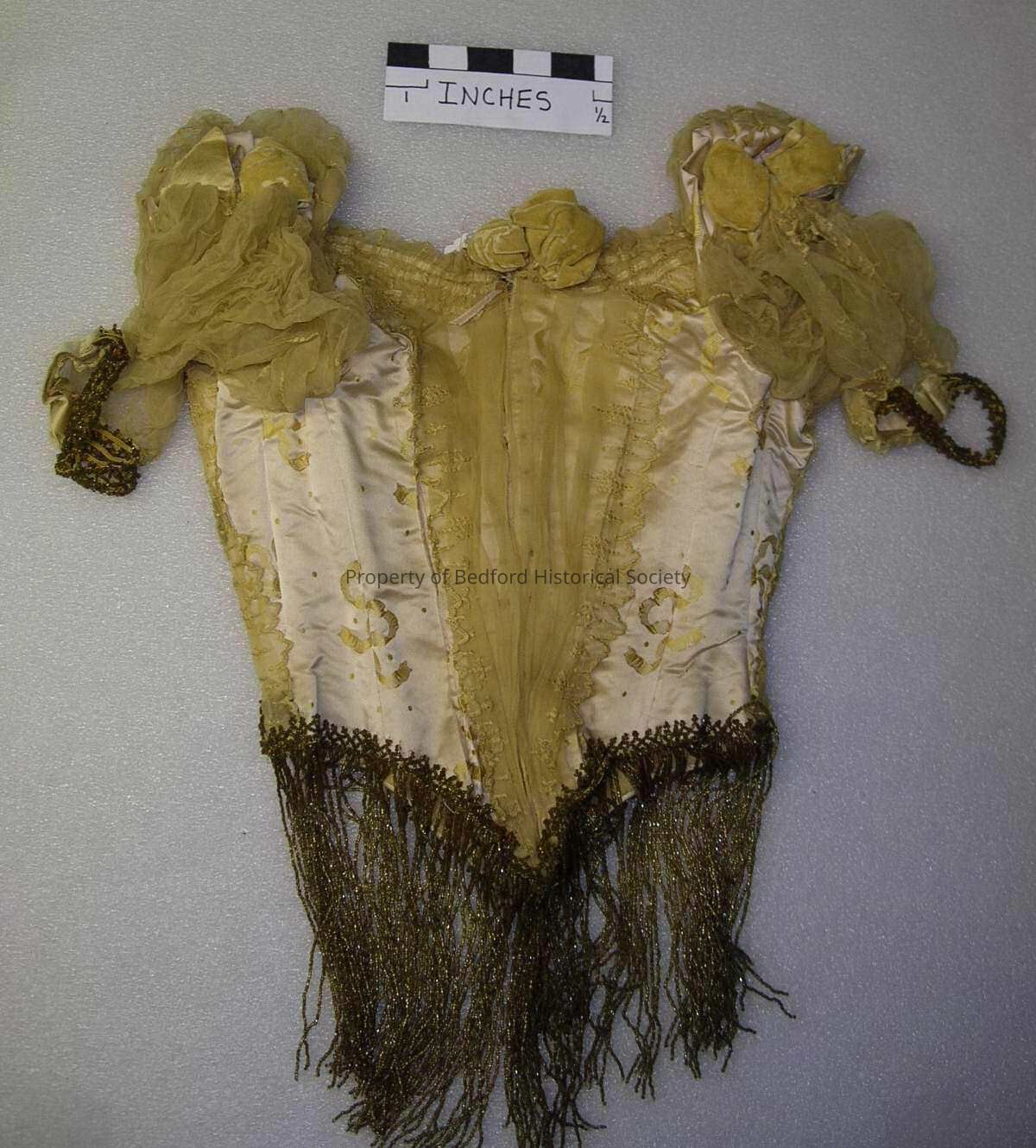 Yellow bodice, 1890s, pale yellow silk brocade woven with a pattern of ribbon tied bows, overlaid in parts with yellow silk chiffon shirred at the open neckline and forming puffed sleeves, sewn with three V bands of amber crystal beads at the bodice front and at the bodice sides with long amber crystal bead fringes hanging from waist about 8 inches long, good condition, very well made.