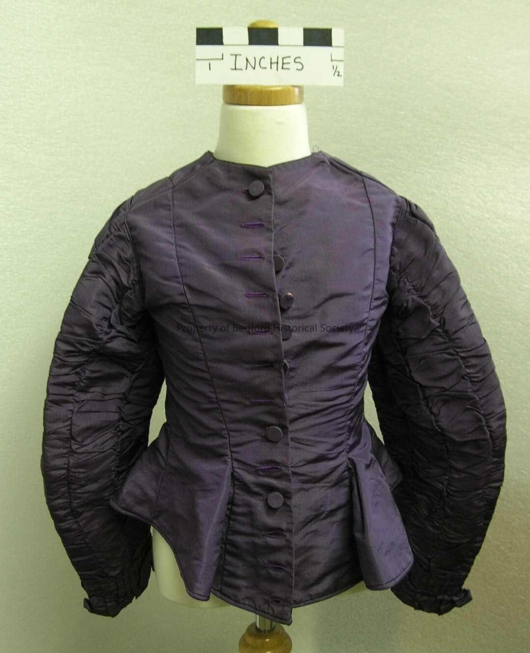 Purple silk faille taffeta fitted bodice with peplum, 1880s, two self-covered buttons missing, interesting shirred long sleeves edged with pleated ruffle, excellent condition.
