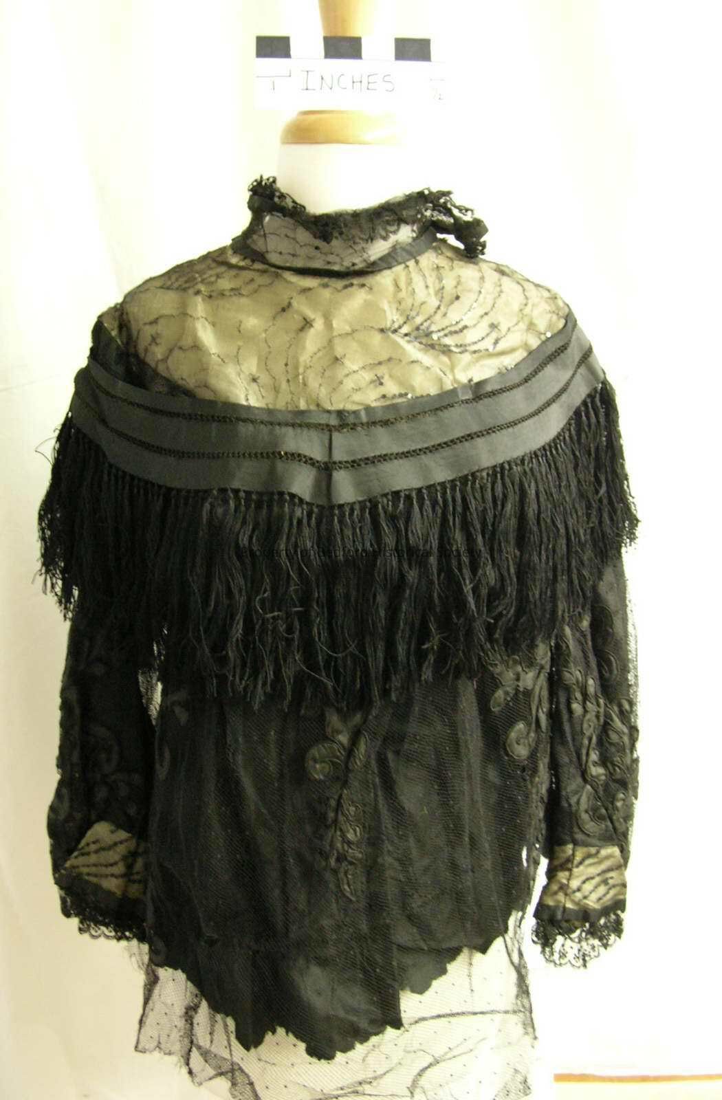 Large mourning bodice, circa 1905-1910, High neck and yoke of black tulle embroidered with delicate floral sprays with small paillettes, the yoke faced with ivory silk taffeta (splitting), the yoke outlined with black taffeta bands connected with stitching with long black fringes, the rest of the bodice of black tulle with black taffeta applique outlined with black cordunnet.