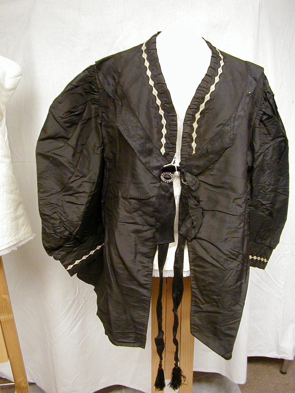 black silk taffeta and ribbon bodice jacket with white trim and brooch clasp