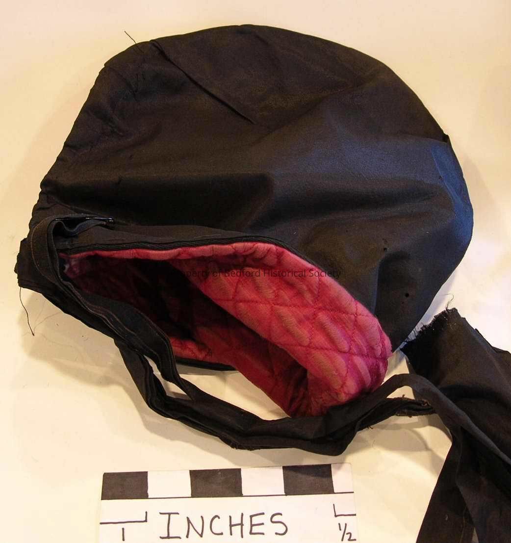 Black bonnet with quilted red lining