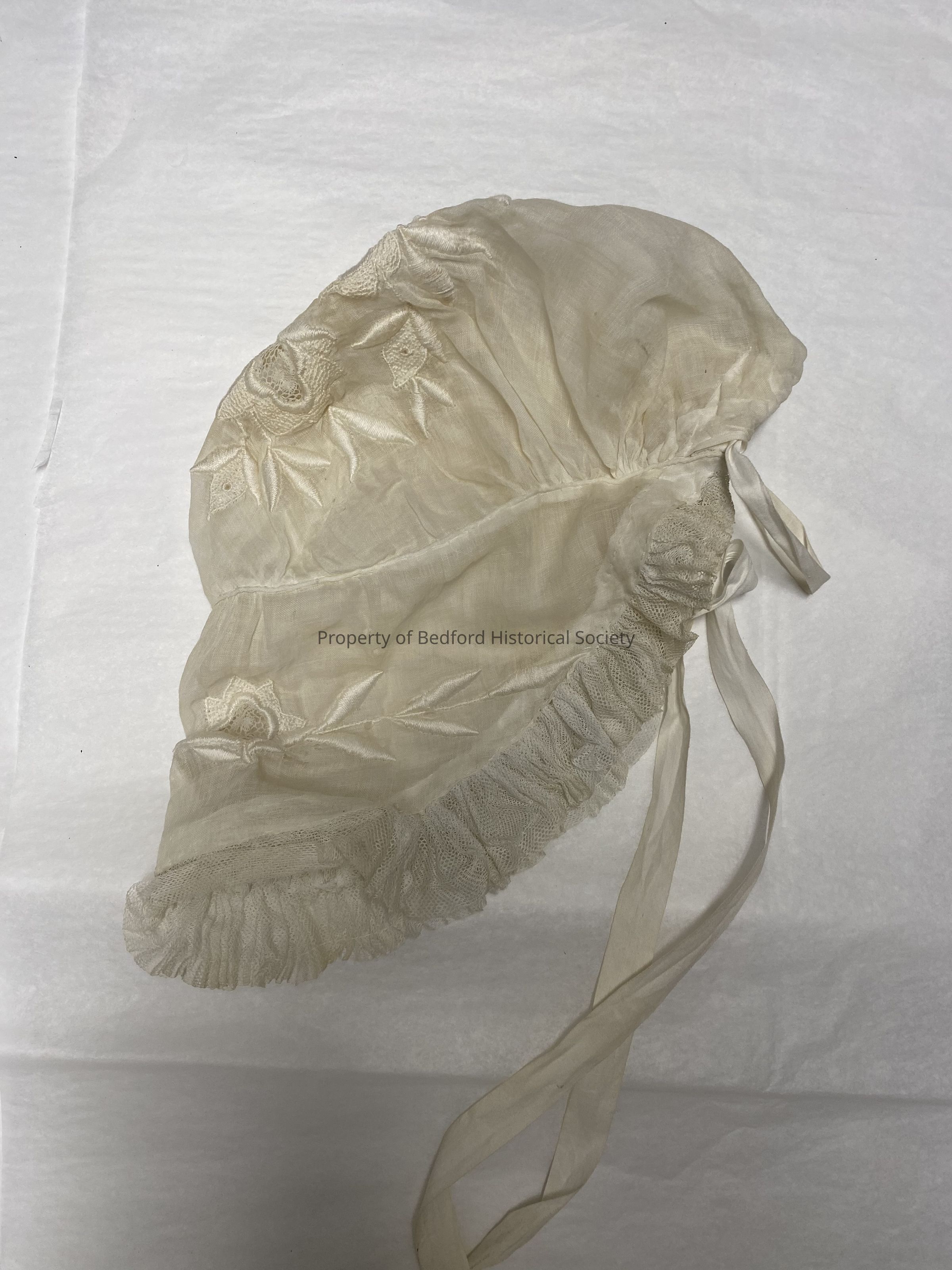 Off-white baby bonnet with embroidery. Found with FIC2021.64.1,.2