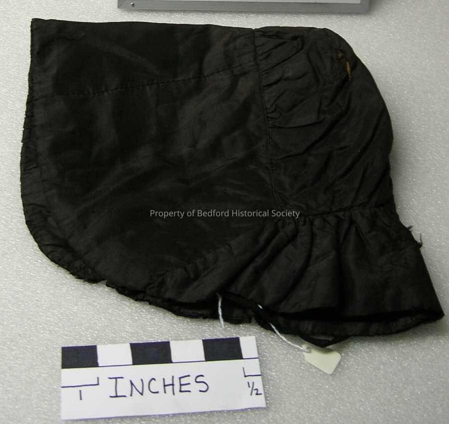 Black Quaker or Quaker style bonnet, silk quilted with padded lining, late 19th century, belonged to Julia Banks Hoyt (1835-1927)