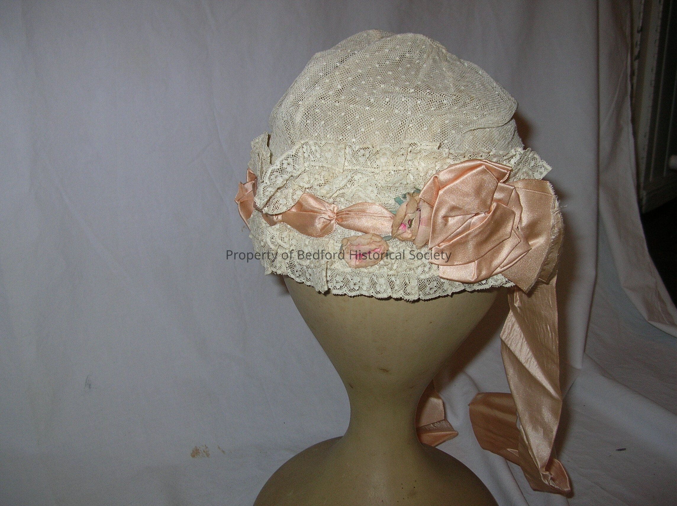 Lace and satin bonnet with satin flower ribbon