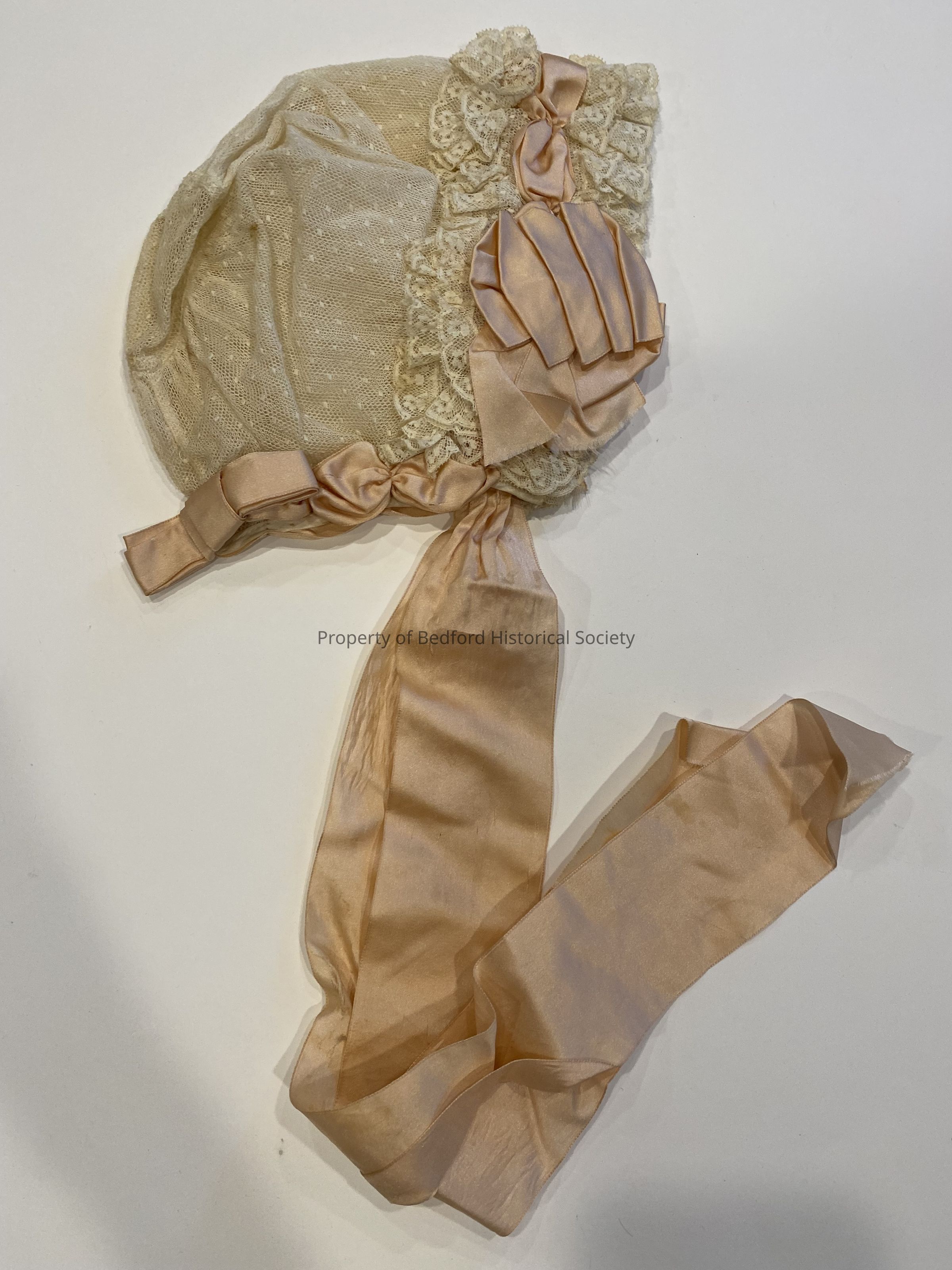 lace baby bonnet with pink ribbon bows and tie