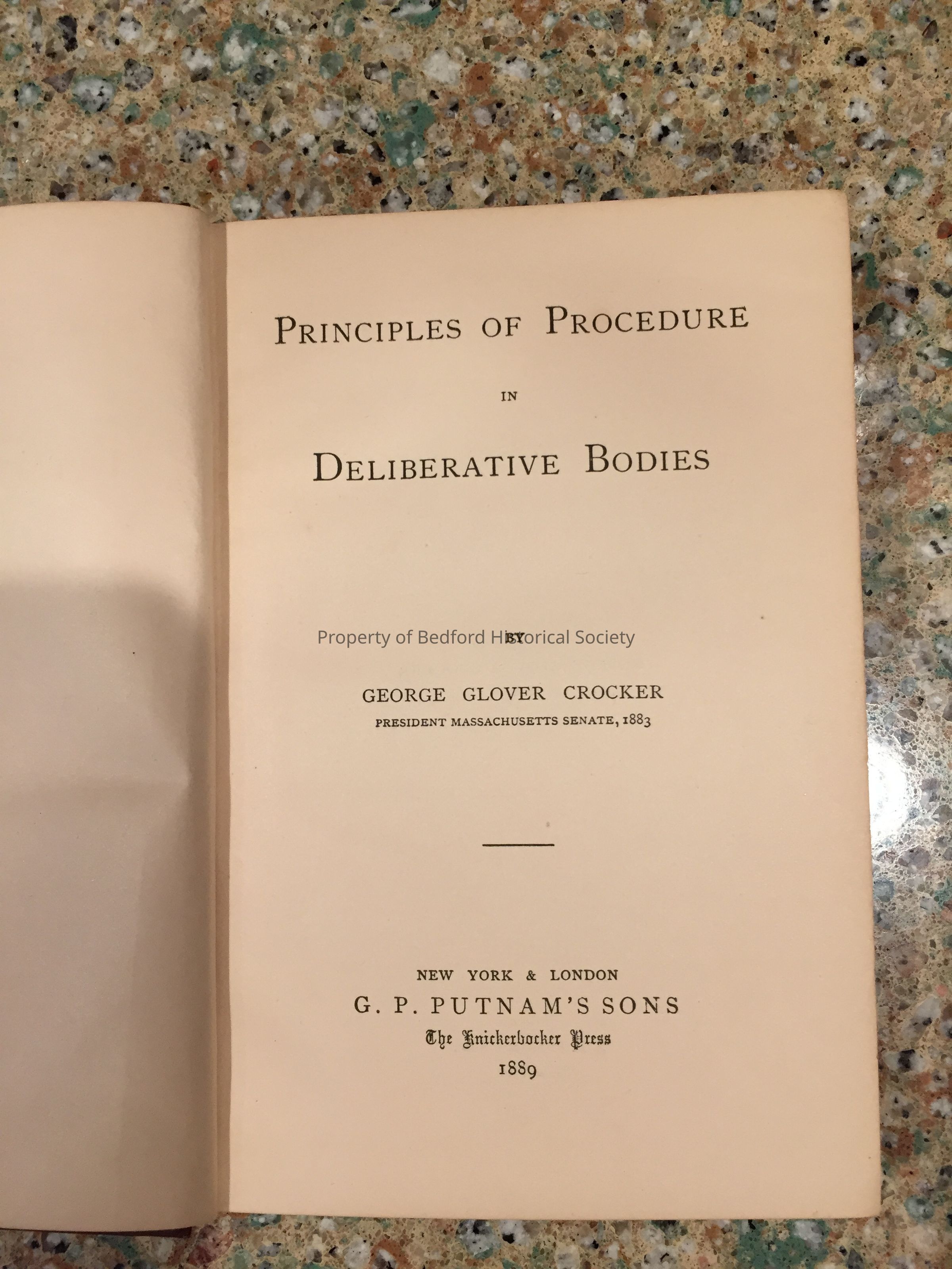 Principles of Procedure in Deliberative Bodies by George Glover Crocker, President Massachusetts Senate, 1883, GP Putnam & Sons, the Knickerbocker Press, 1889.