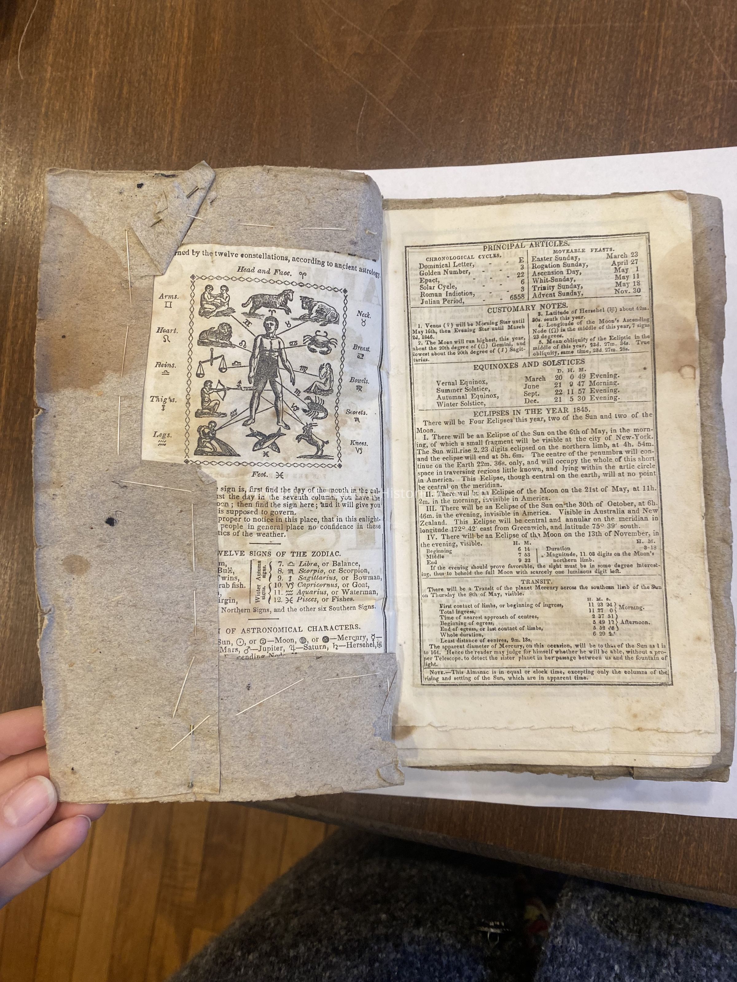 Bound collection of Almanacs from 1845-1868 paper bound collection of almanacs tied together with string, each individual one bound with thread