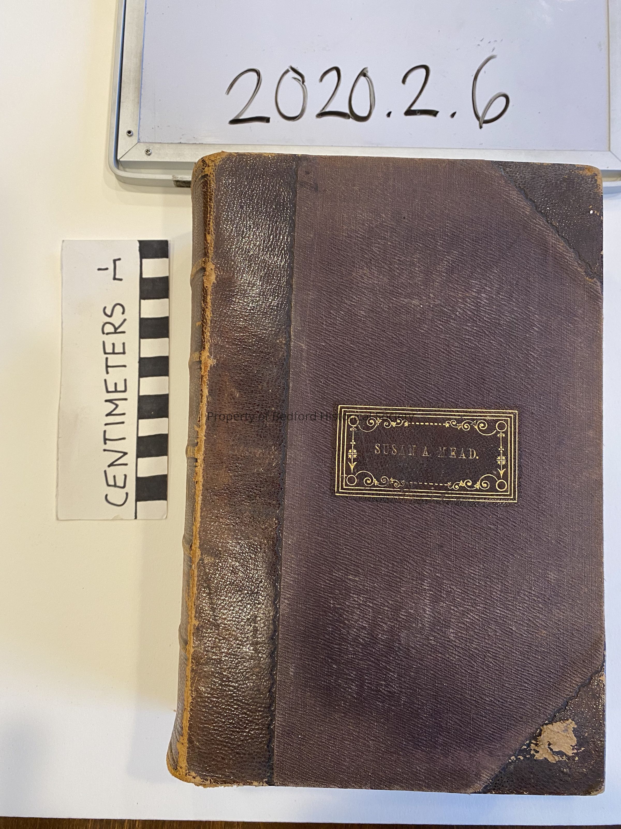 Leather bound copy of Godey's Lady's Book from 1862 with gold print inscription on cover "Susan A. Mead" 6 1/16" W, 9 1/2" L, 2 1/16" D