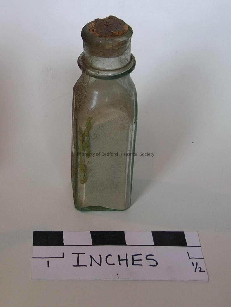 Bottle, with cork and sand, green glass