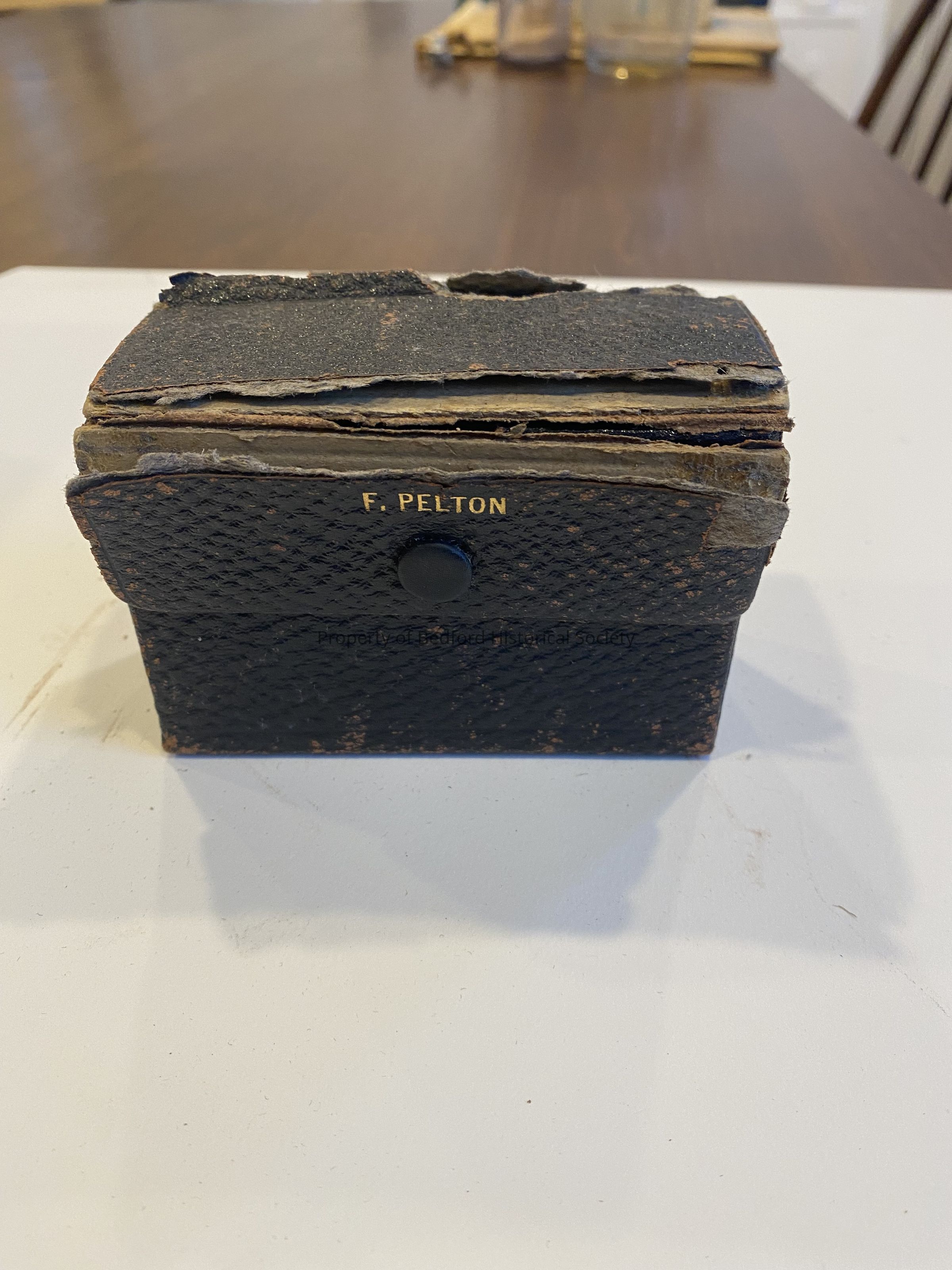 leather box of cards with monogram F. Pelton (Frederick Pelton) who was VIce President of Mount Kisco Bank. Pleaying cards have image of woman ca. 1900-1910 holding box of bob bobs. Inside of box reads "Compliments of Kisco House Mount Kisco, N.Y."
