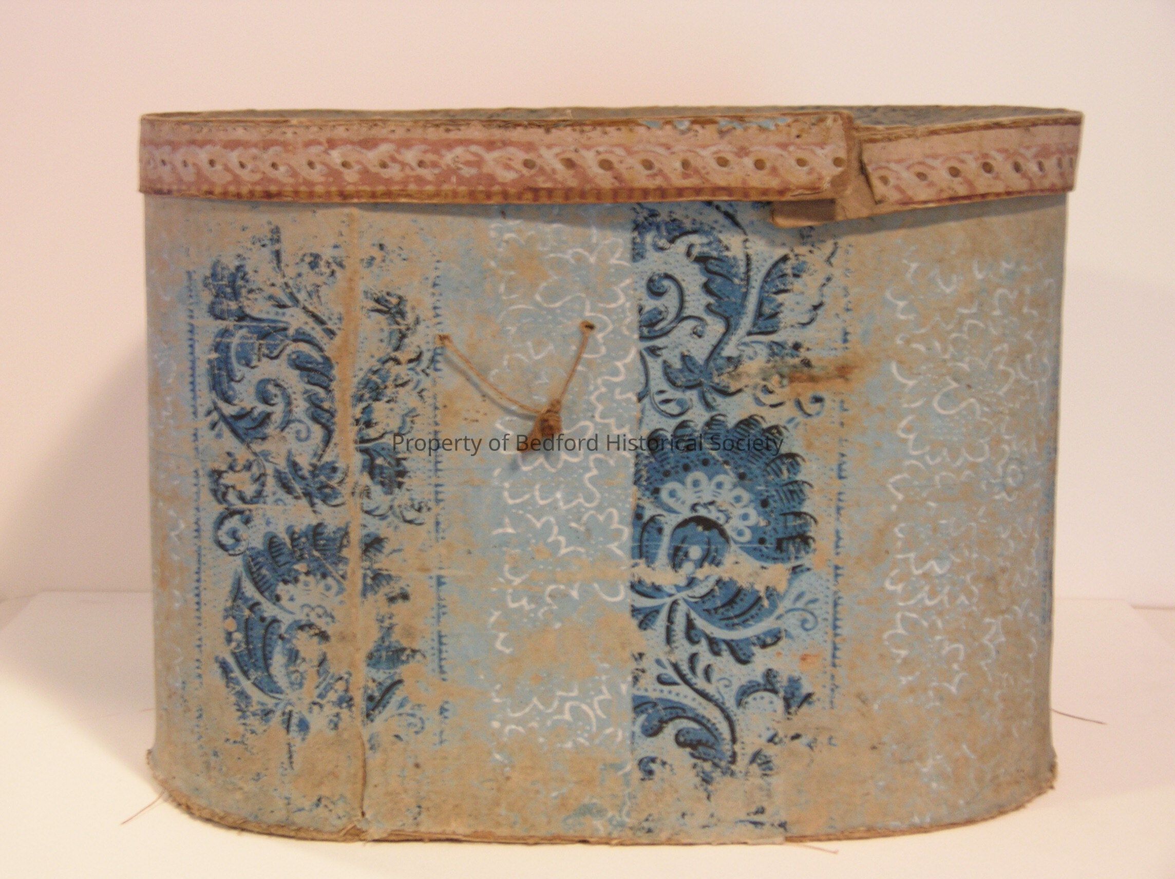 Wallpaper hat box in blue, with cover, circa 1830, 11 1/2" tall, 16" long.