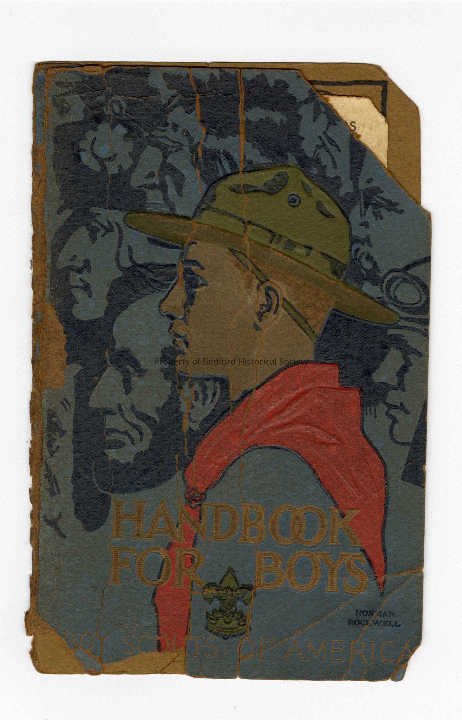 cardboard "Handbook for Boys" Boy Scouts of America guide book with drawn illustration of boyscout with safari hat, red cape and images of presidents on a blue background originally drawn by Norman Rockwell.