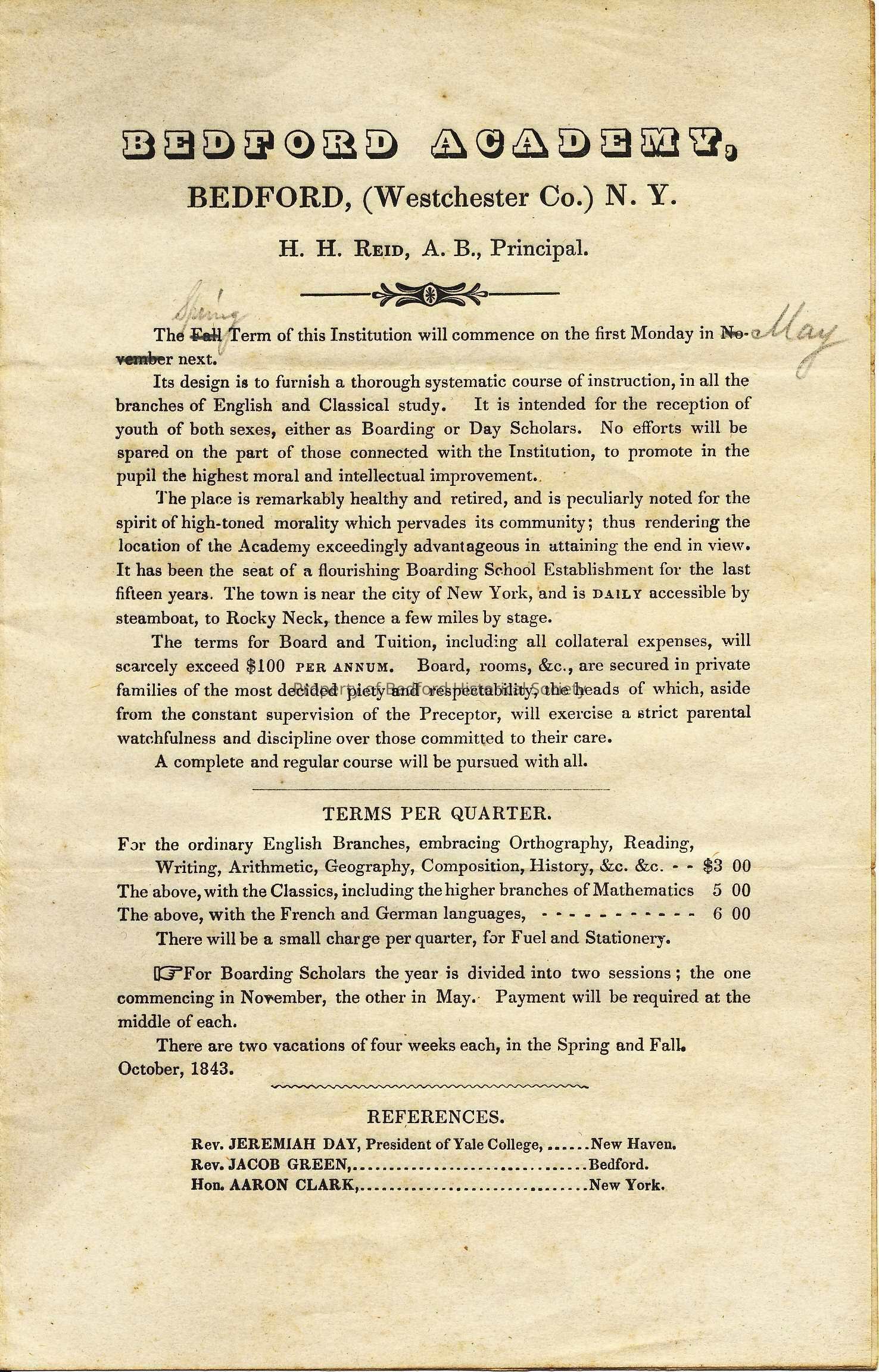 Brochure for Bedford Academy, 1843; H.H.Reid, Principal