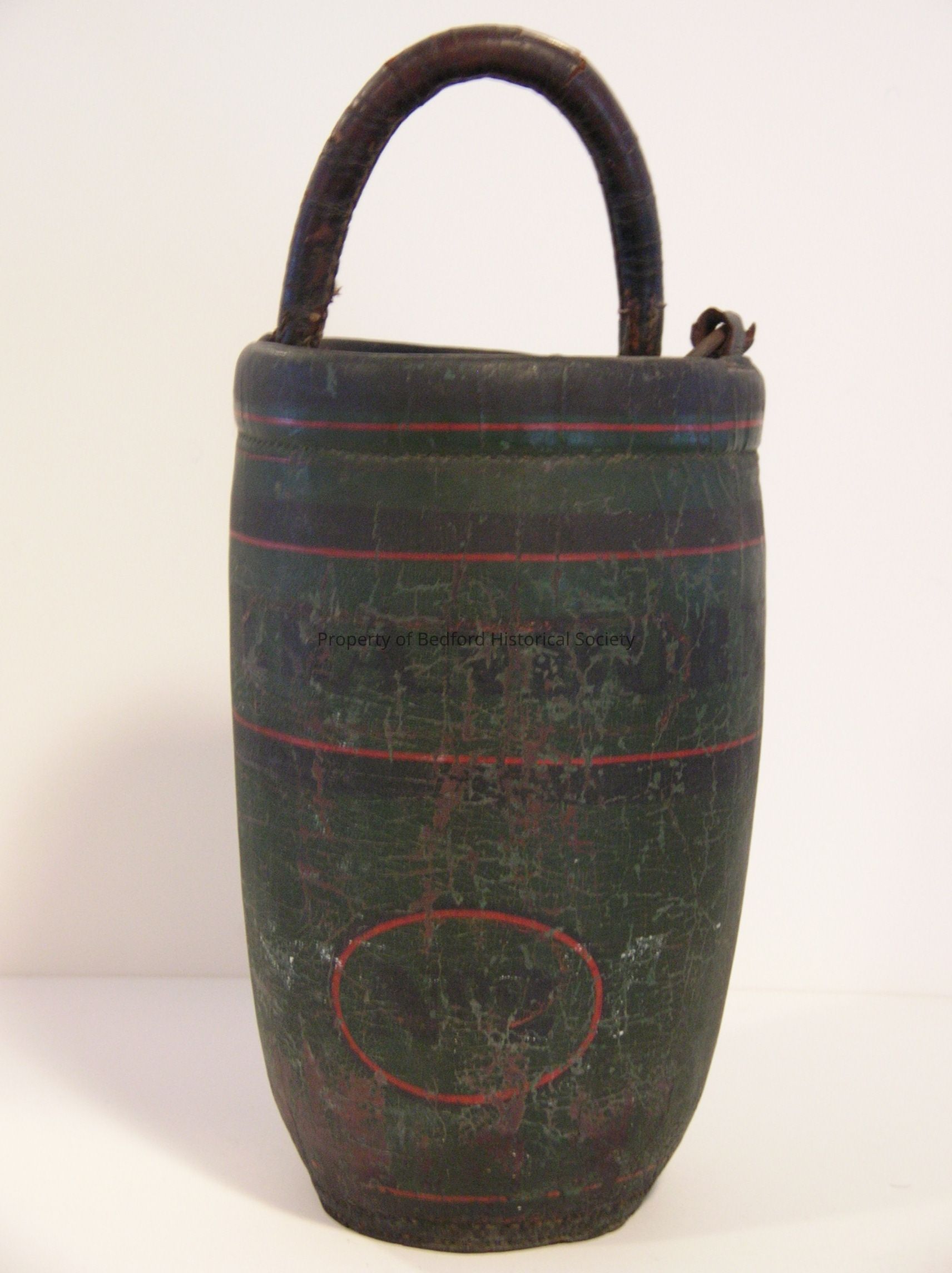 Leather fire bucket marked E.D. Sanborn - #2 (green and black). Early 19th Century, 13'' tall, 8'' across. Handle of the bucket is detached on one side. Cracking, Chipping, Fading.