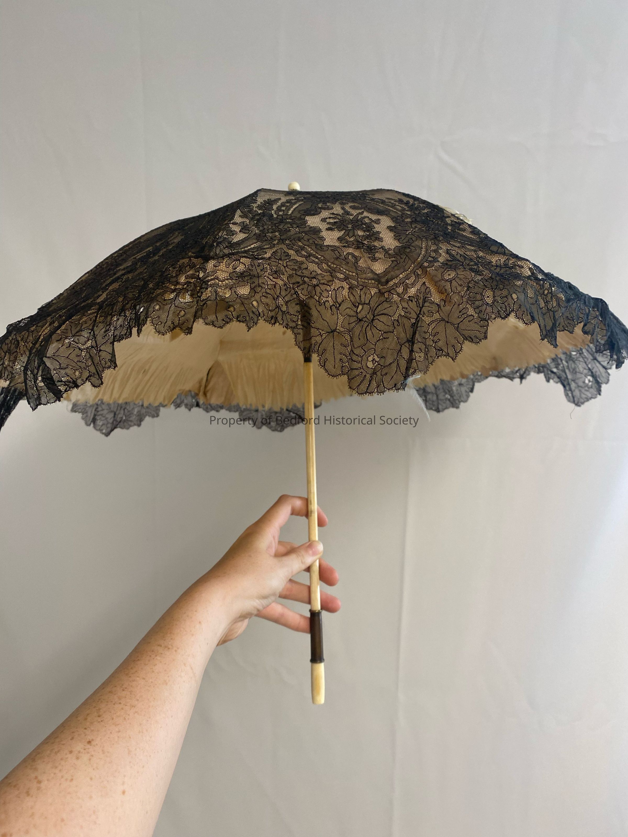 black lace umbrella with silk lining and ivory handle with tassel hanging from ferrule