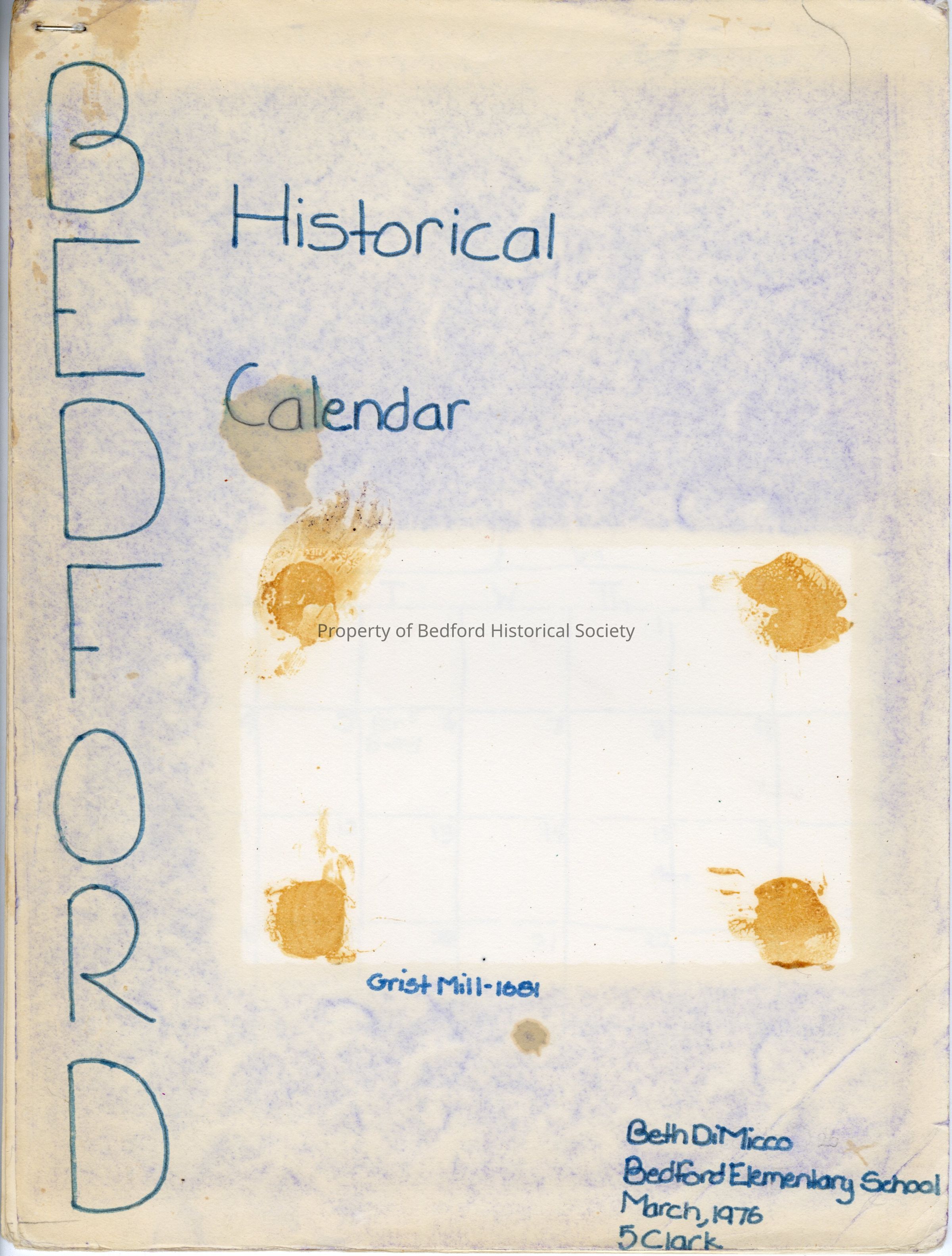 Home-made calendar by Beth DiMicco at Bedford Elementary School. Each page has drawings of different parts of Bedford Village in purple ink