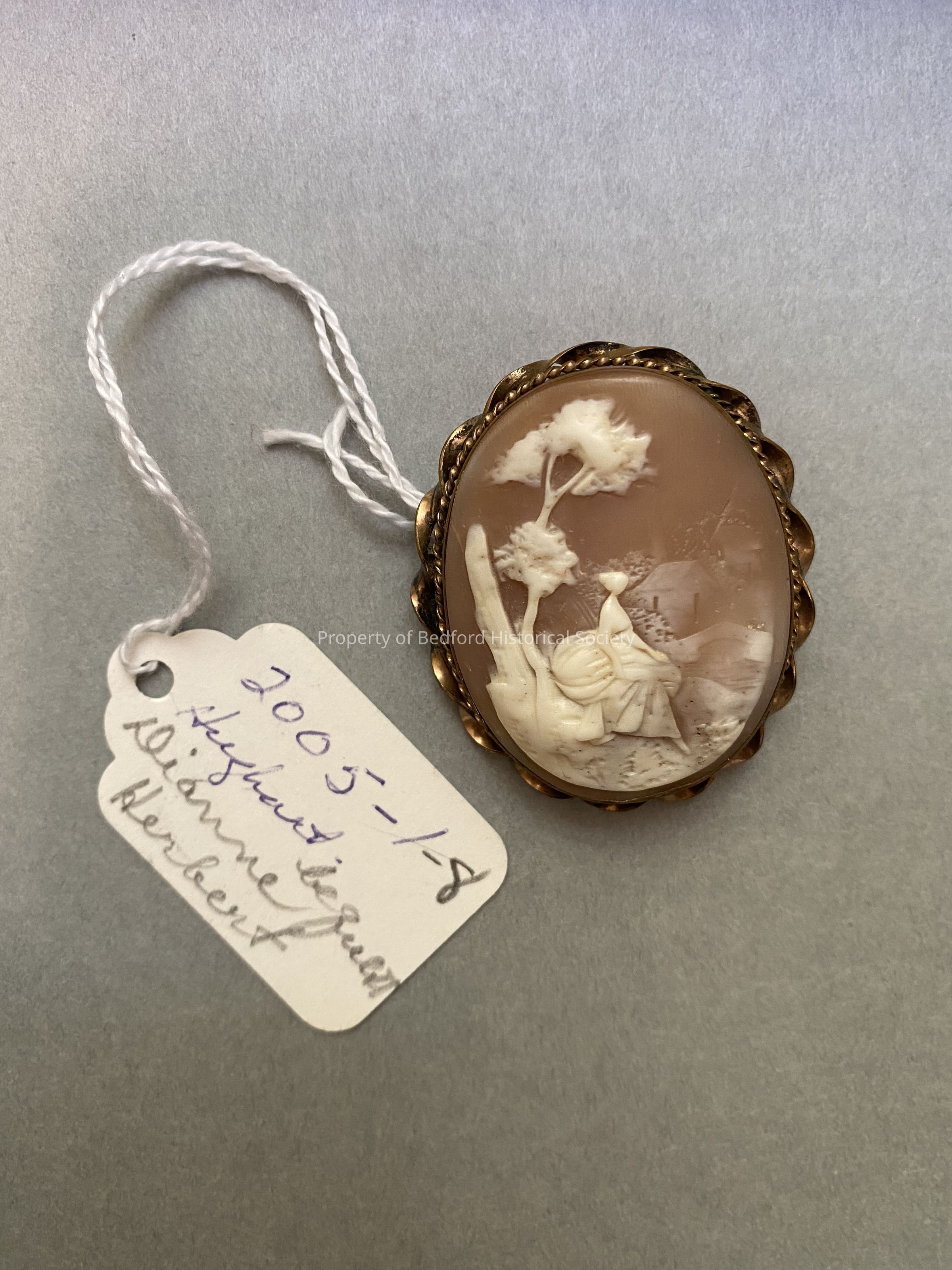 Cameo brooch of woman sitting in front of tree Tag reads: Dianne Herbert Leqeur