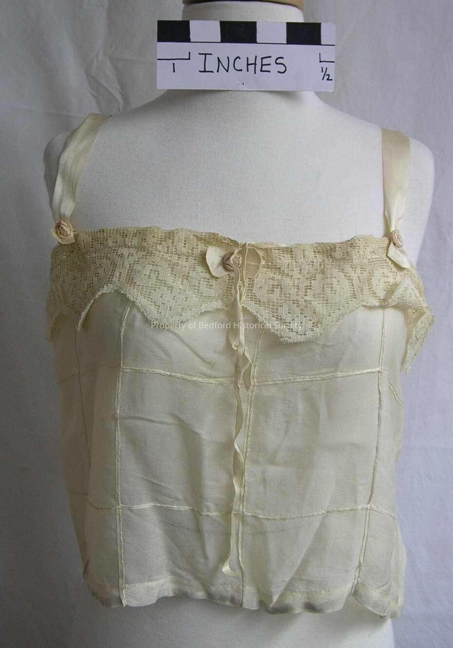 Camisole (underwear) 1920s, pale ivory silk mousseline worked with pin tucks in a large grid pattern, top border of buratto lace, straps of ivory satin ribbon, good condition.