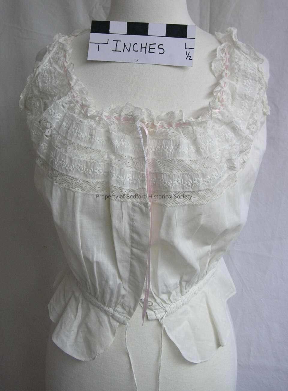 Camisole/corset cover, 1890s, cream cotton with wide yokes of bands of Valenciennes alternating with bands of self embroidered cotton, button front, drawstring waist, good condition. Initials: L.E.P. in ink.