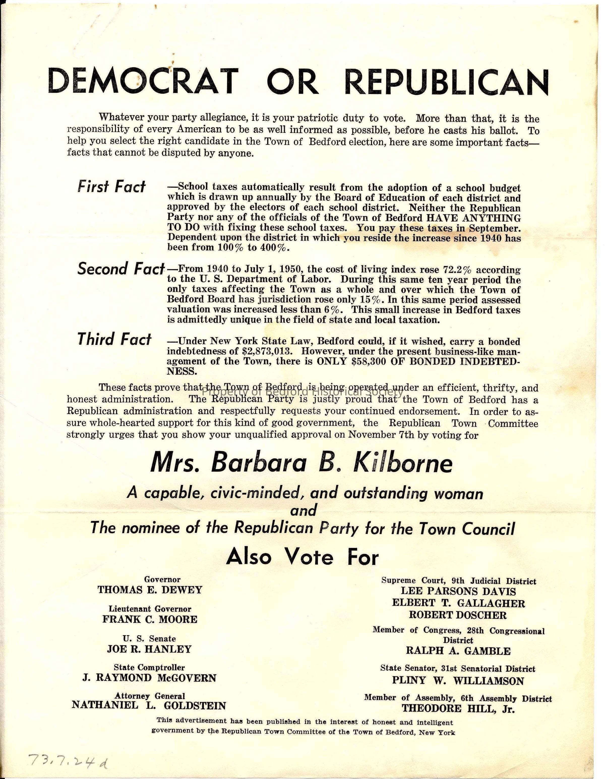 Campaign advertisement for Mrs. Barbara B. Kilborne, 1950, Republican Town Committee of the Town of Bedford