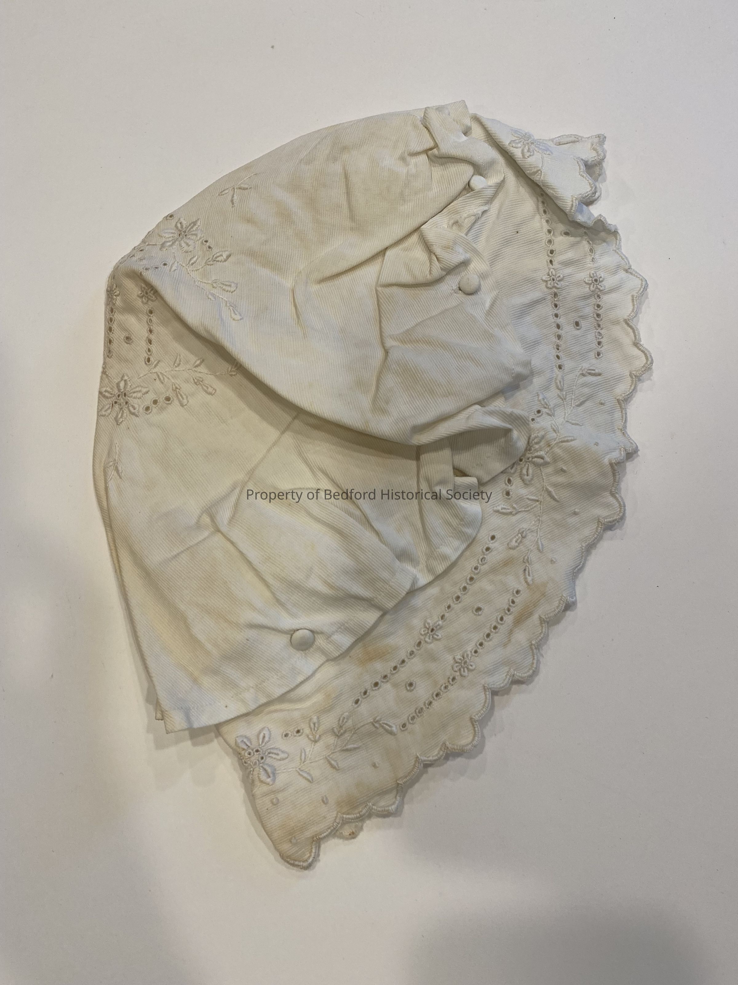 white linen baby cap with eyelet embroidery