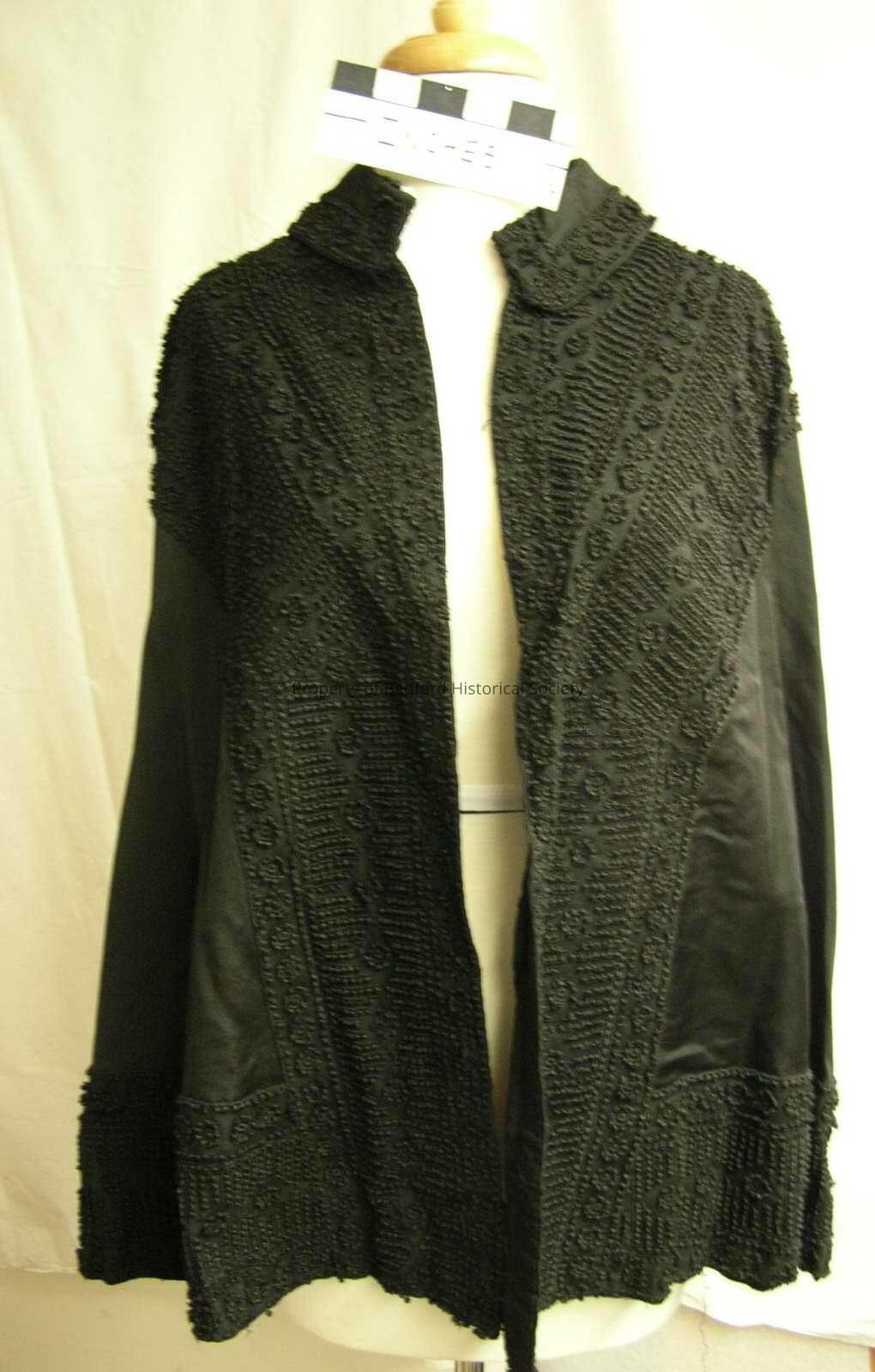 Afternoon/evening wrap, circa 1900-1910, black silk trimmed with black mesh embroidered with three dimensional balls in a geometric design, label: Importers Paris London Joseph Horne Co., Pittsburgh, Pa.