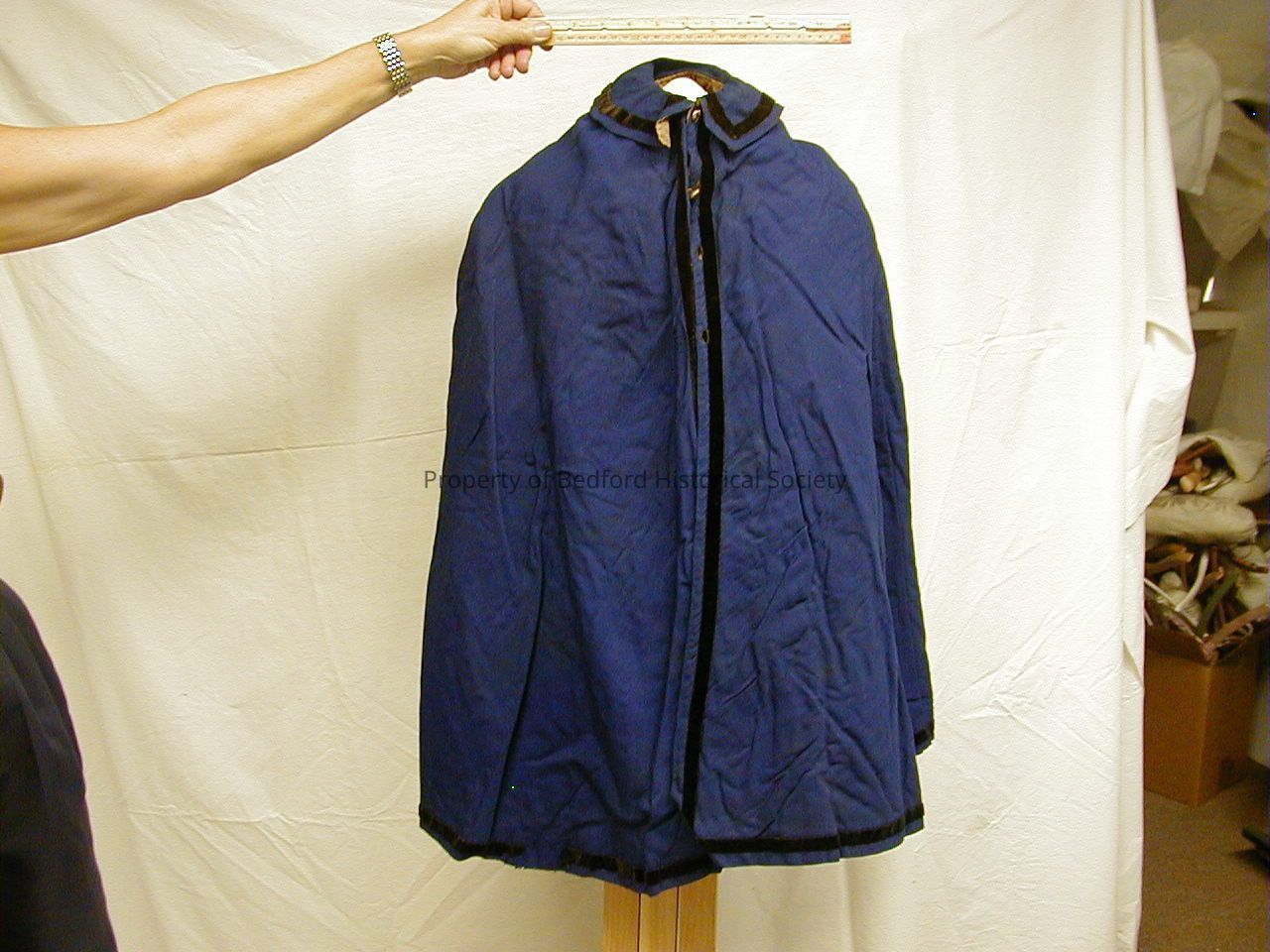 blue civil war cape with velvet trim, found with old note attached "Edgar Hoyt's capes"