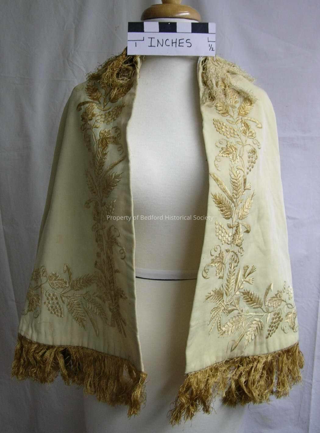 Capelet, late 19th century, ivory wool flannel embroidered with bow ties bunches of grapes, sprays of flowers, sprays of wheat, with golden beige fringe, some discoloration.